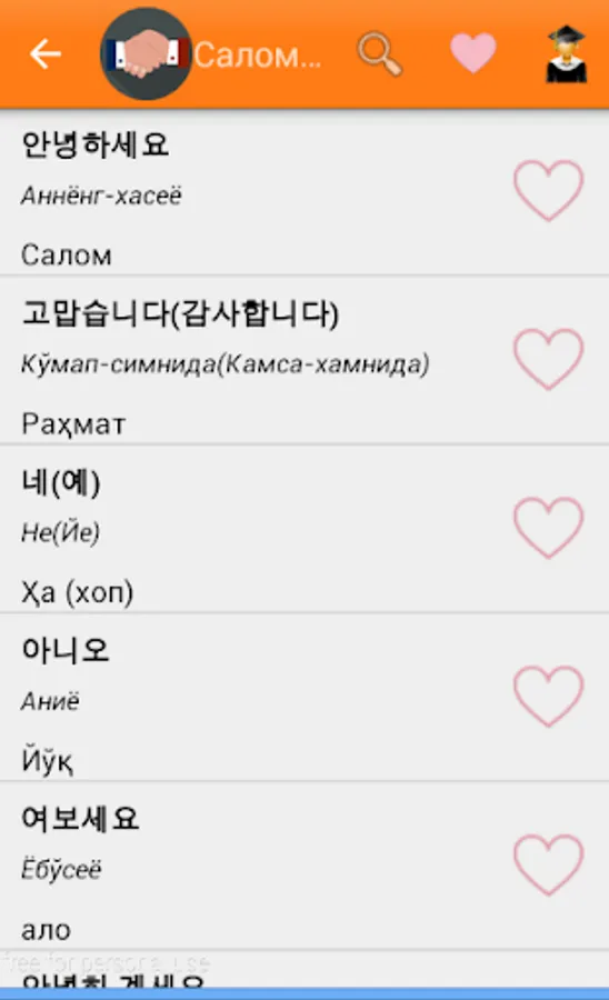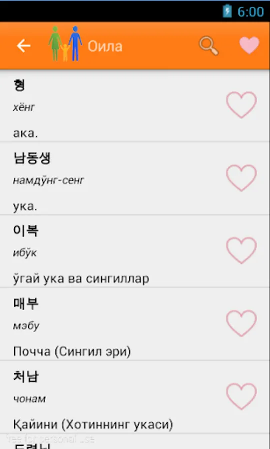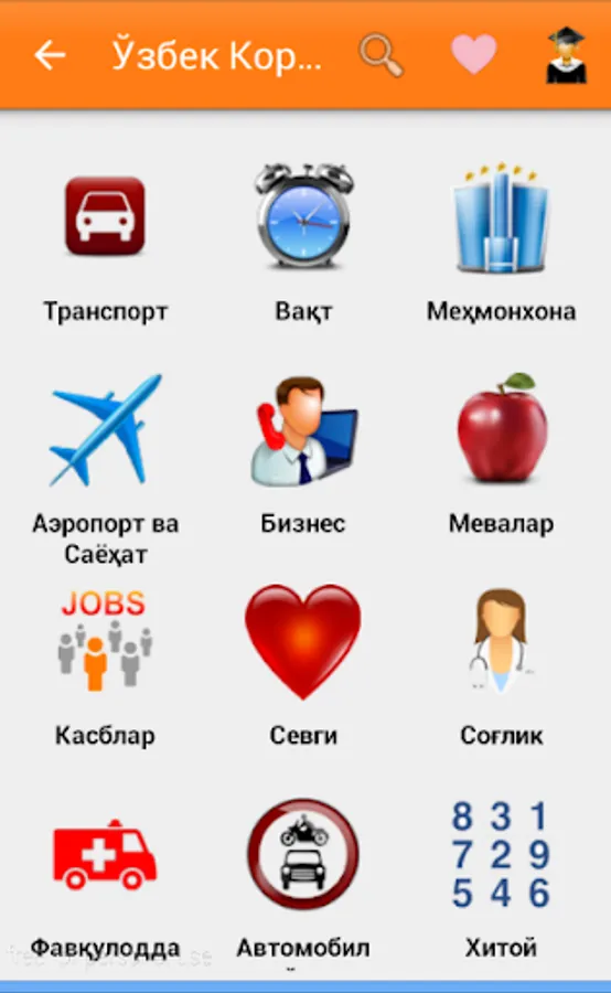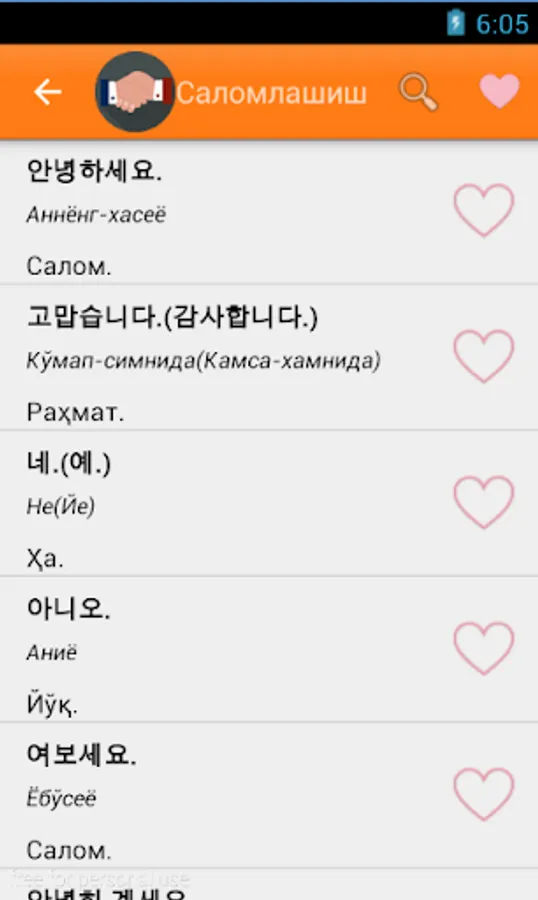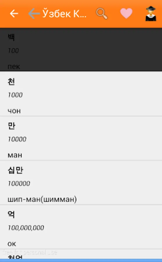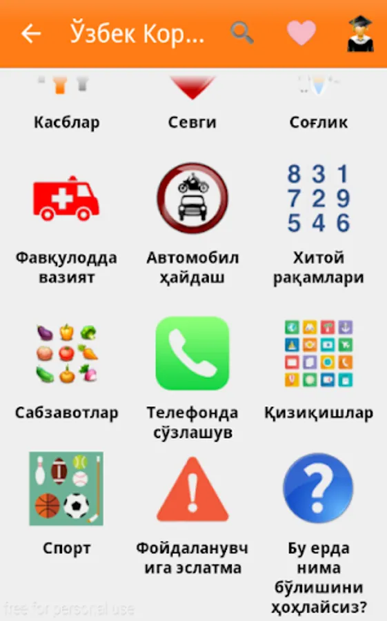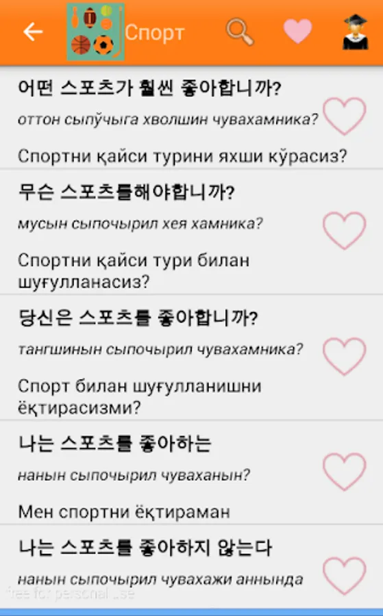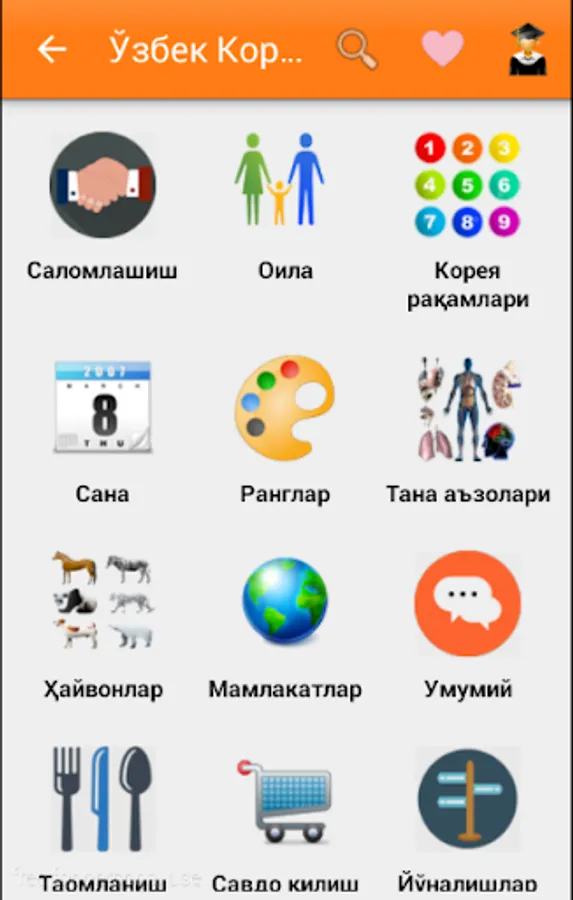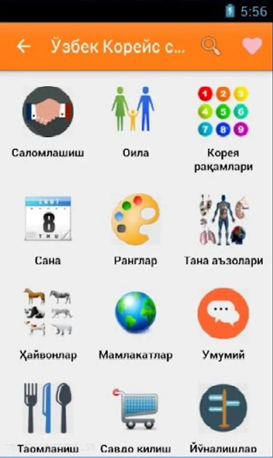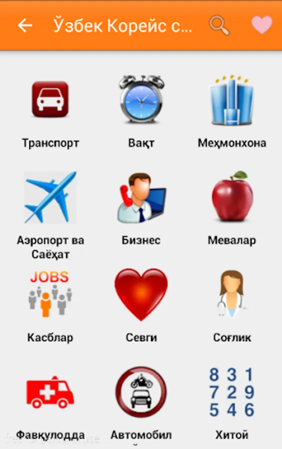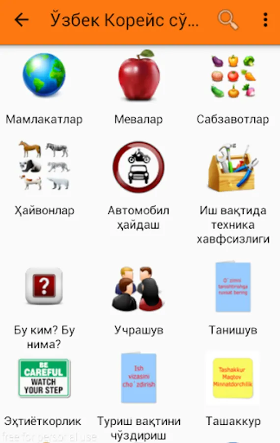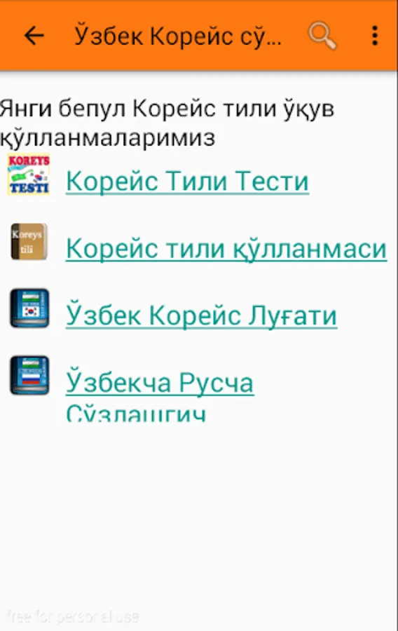 O'zbek-Koreys so'zlashgichi ko`plab bo'limlardan iborat. Sayohat va ishlash maqsadida Koreya davlatiga ketayotganlar uchun eng qulay va sodda dasturamaldir. Kundalik hayotimizda uchraydigan so'zlardan iborat. Qolgan bo'limlar ish jarayonida. 1-6 bo'limlar bepul bo'lib, qolgan bo'limlar pulli. Ya'ni maxsus kod orqali ochiladi.