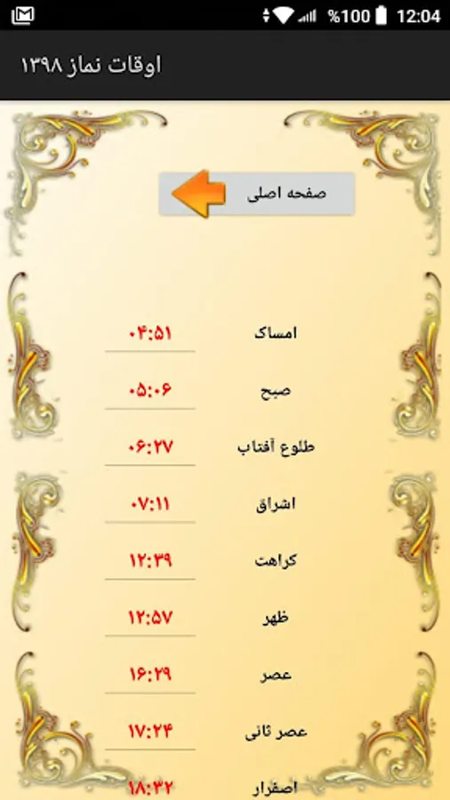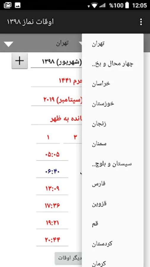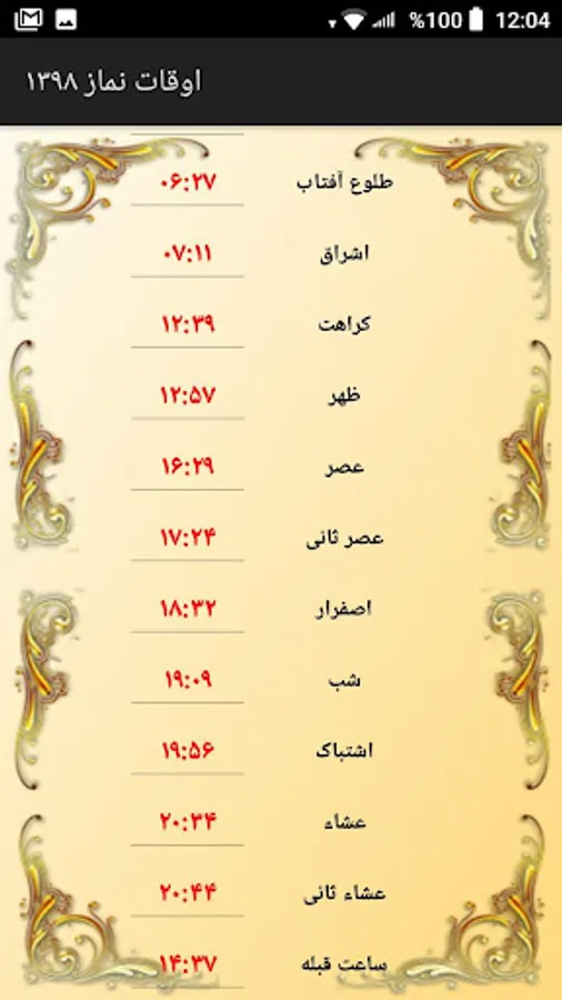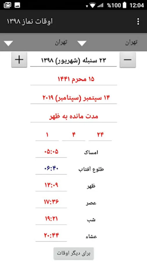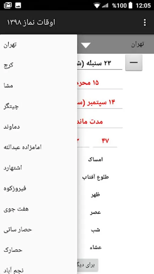Our program, after downloading for once, the prayer times of that year for all cities of Iran by choosing the province and city of your choice, you can easily see the prayer times without the need for an internet connection; And in addition to the five times of prayer, observe the times of enlightenment, hatred, evening, the second age, asceticism, ablution, supper, the second supper and the time of qibla.