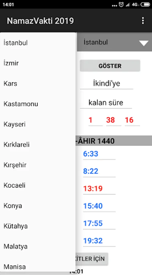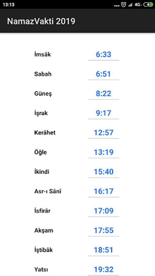 Application of our prayer times, which is the highest authority of the Ottoman scholars (Meshikhat-i Islamiyya) s prepared by 1334 [m.1916] years of (Ilmiyye Sal nâ to) the Istanbul University with the calendar name Kandilli Observatory 1958 date and No. 14 (Turkey-off House floor -I Sharia) is hesâblan according to the procedures in the inscription.