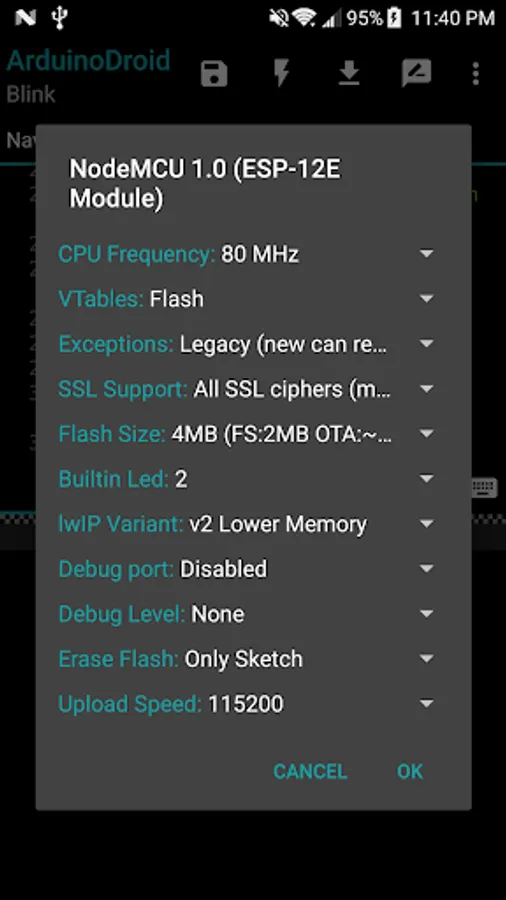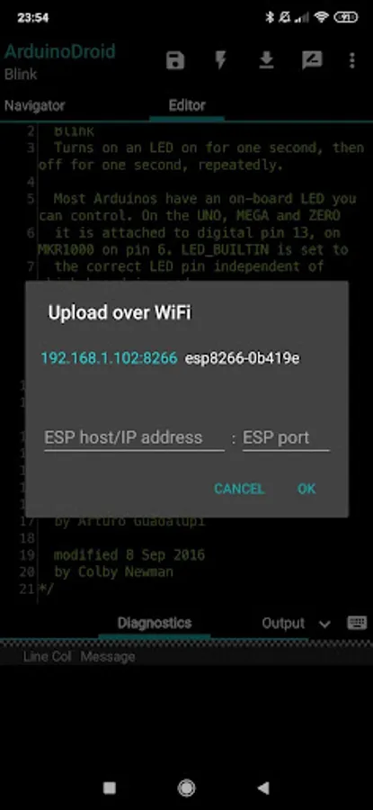 * upload sketches over USB (all ESP8266 boards, all ESP32 boards, Arduino Uno/Uno_r3, Duemilanove, Nano, Mega 2560, Leonardo, Micro/Pro Micro, Pro, Pro Mini, Yun, Esplora, Robot Control, Robot Motor boards are supported, android devices with USB-host support required) and WiFi (OTA for ESP8266/ESP32)