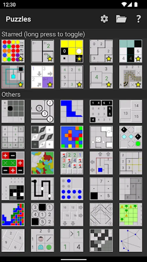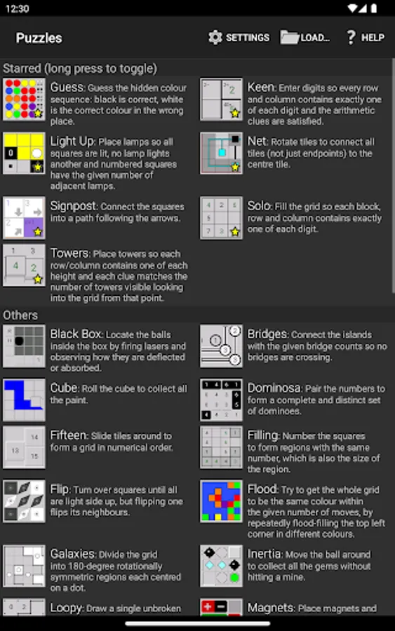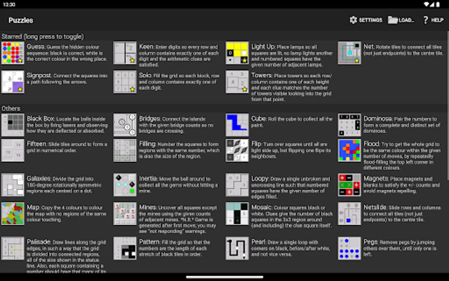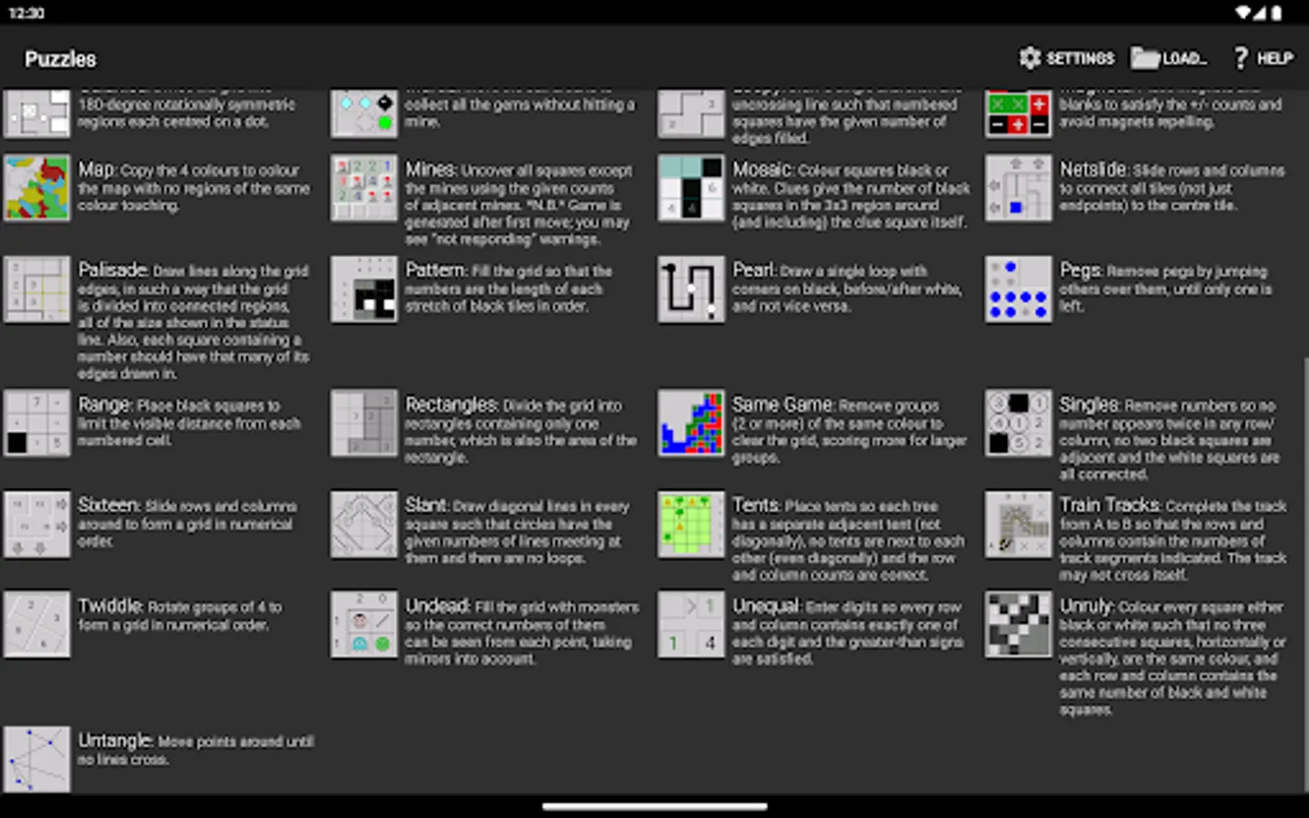 See the screenshots for the full list of 40 different games. They're all generated on demand with adjustable size and difficulty, so you'll never run out of puzzles.