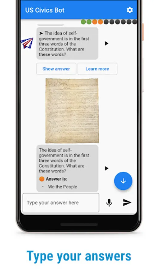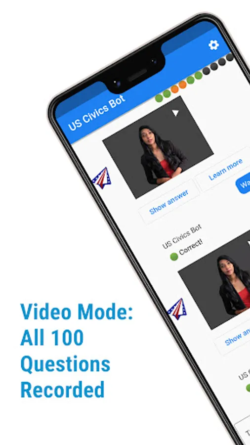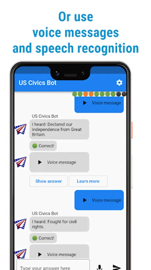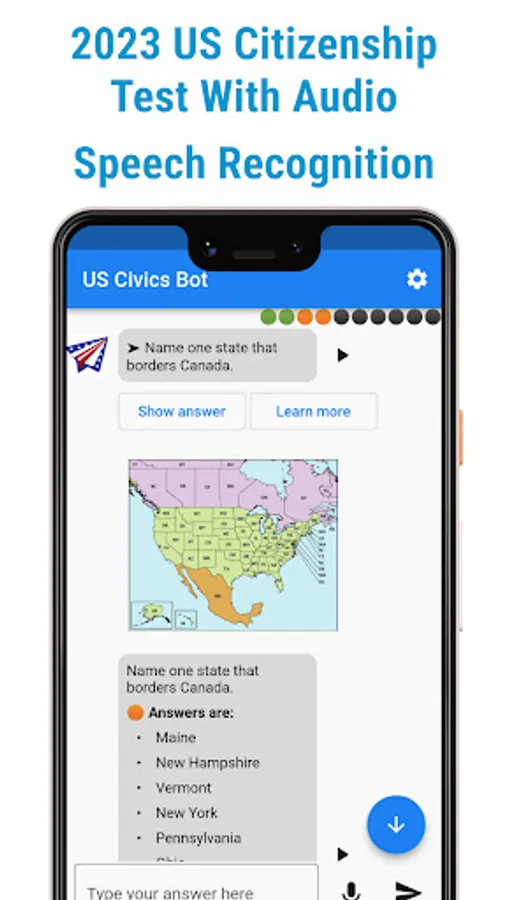 Are you preparing for your US citizenship test in 2023? Try this chat app with speech recognition and see how ready you are to the real interview! Choose text mode, voice mode, or watch the recorded videos of the questions. Type or say your answers, and the app will check them and show you the correct answer.