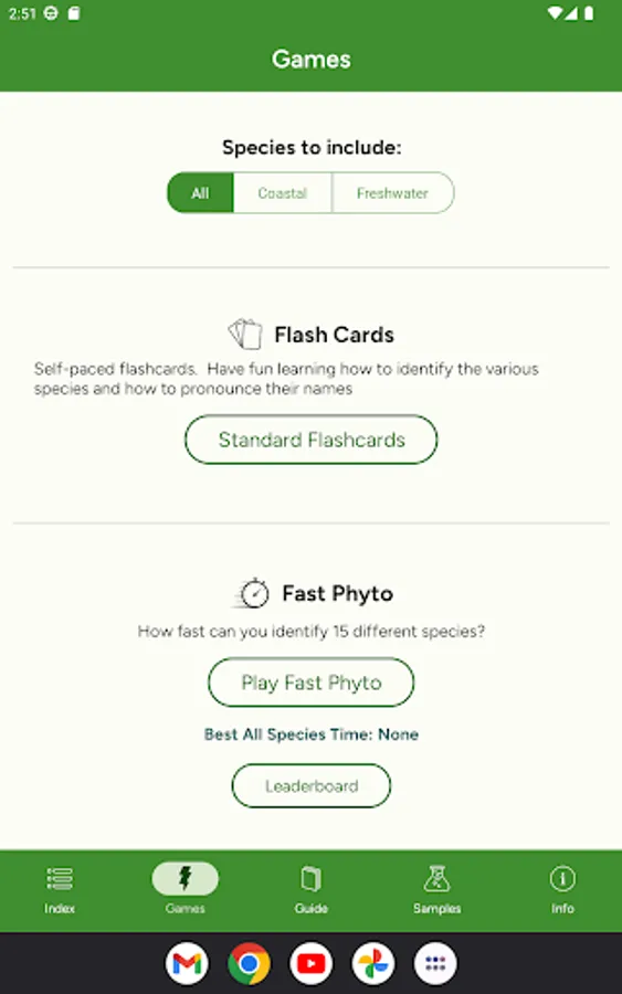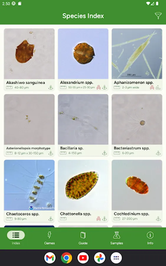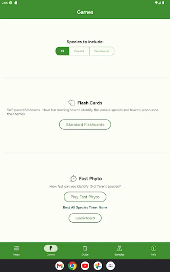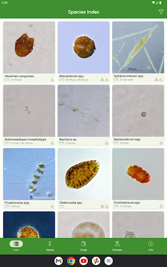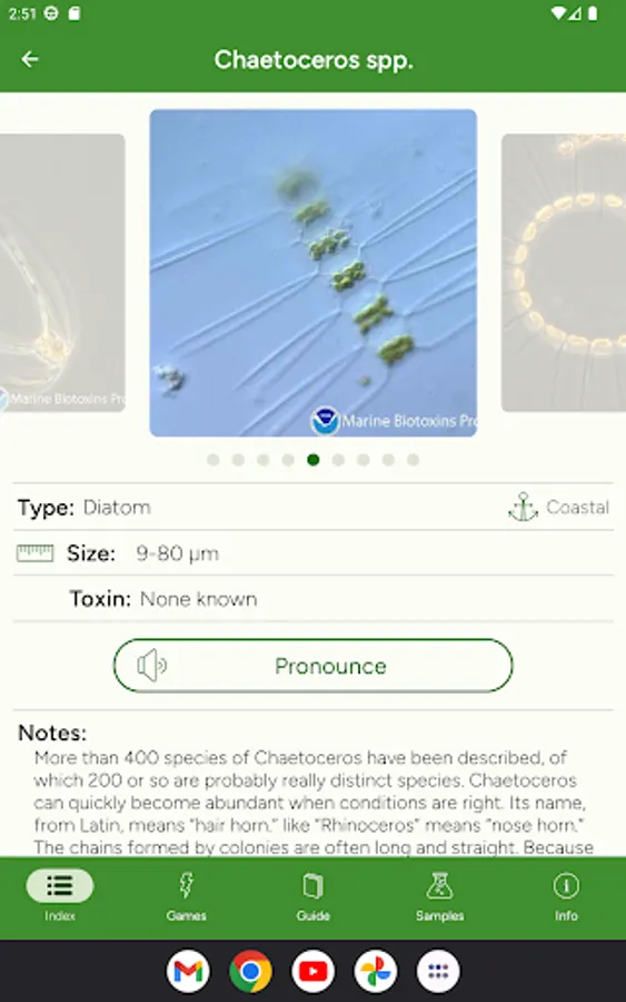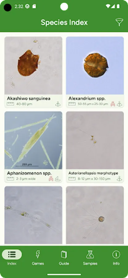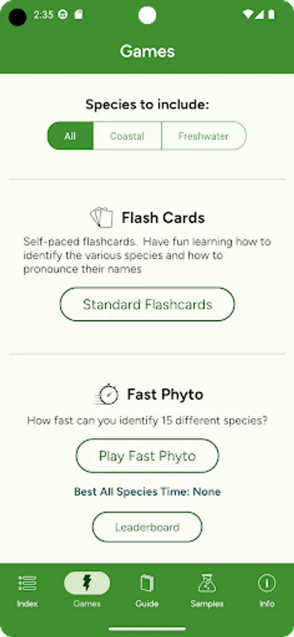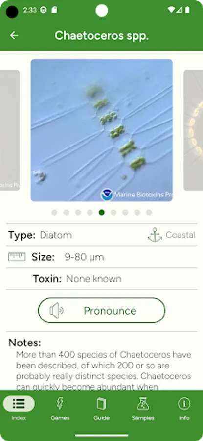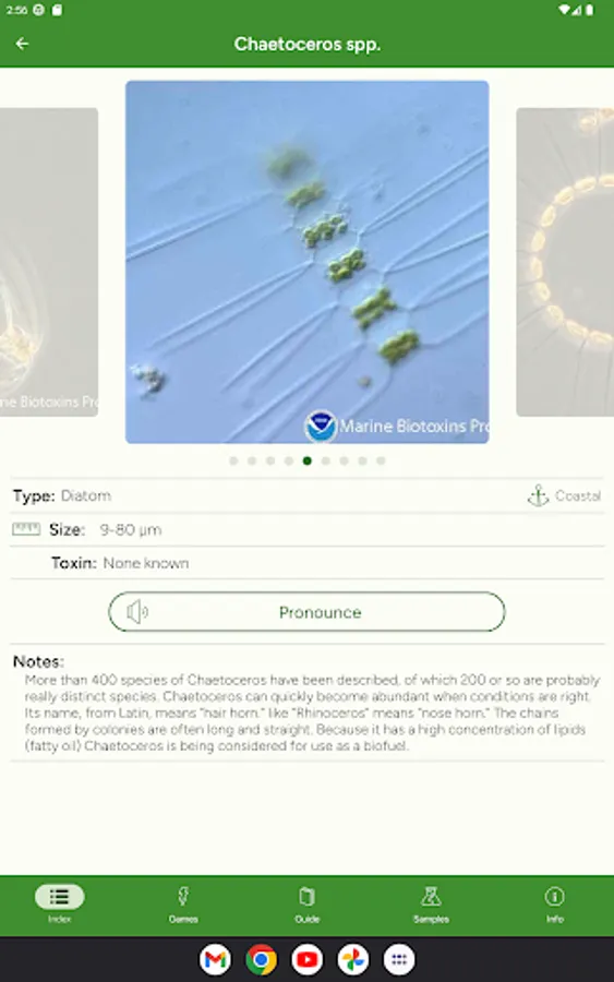 Phyto helps you learn to identify phytoplankton and their proper pronunciation. It includes the most common marine and freshwater phytoplankton.