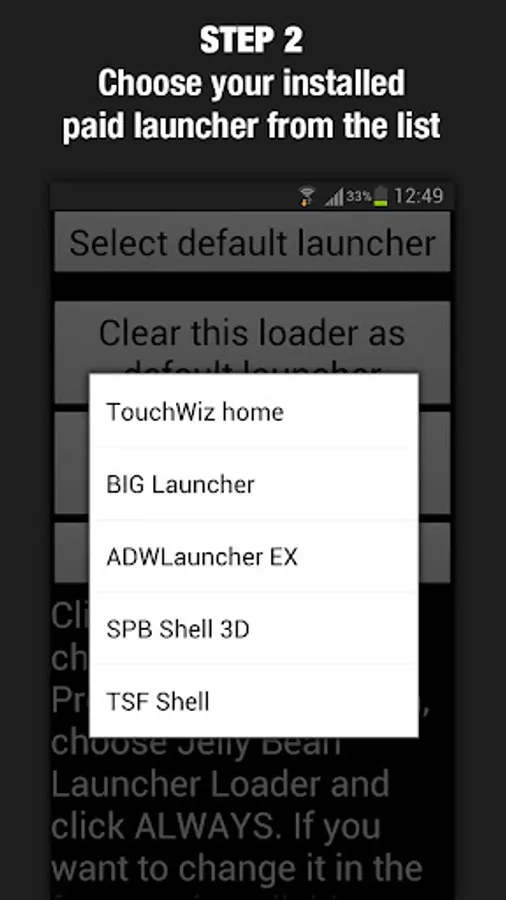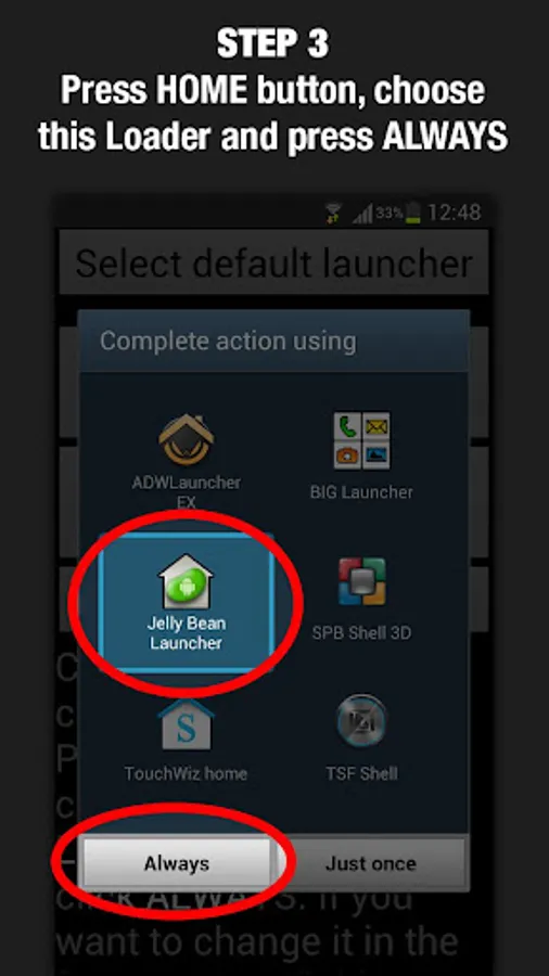 3) Press the HOME button, choose 'Jelly Bean Launcher Loader' and click ALWAYS.