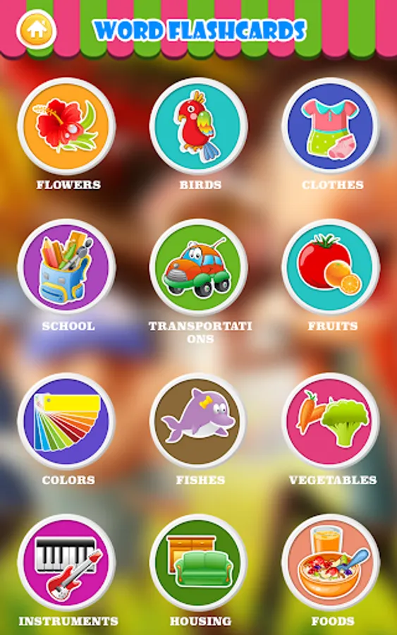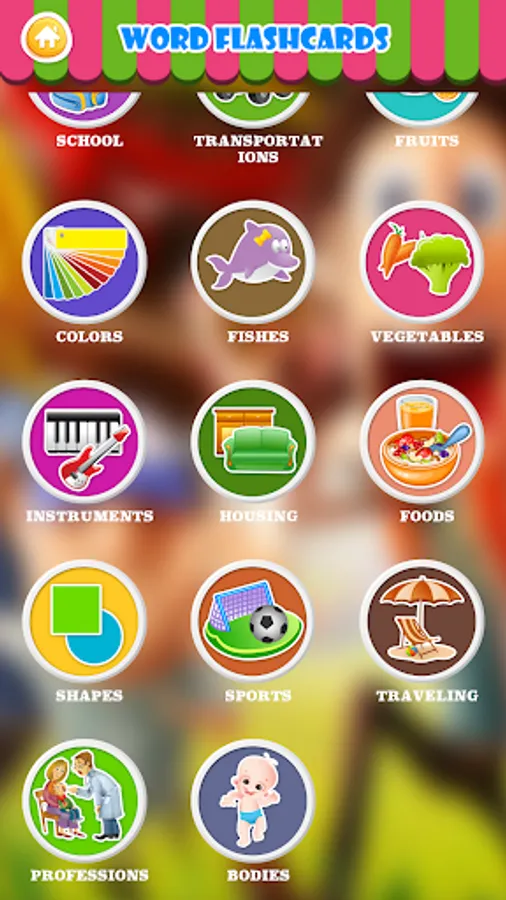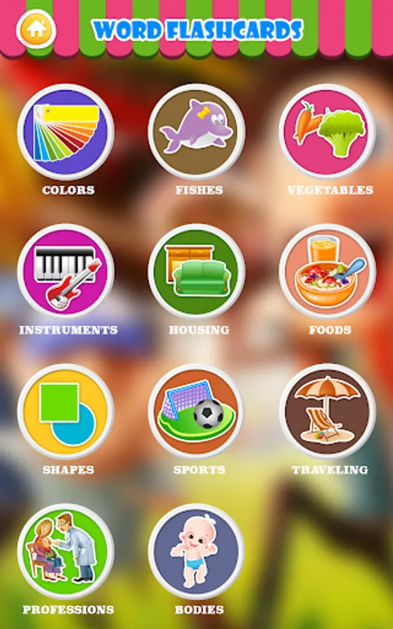Word Flashcards part with 500 Flashcards in 20 topics which designed carefully that suit for Kids's Learning. Beautiful pictures, audio and sound with touchable objects can make children like to learn new things.