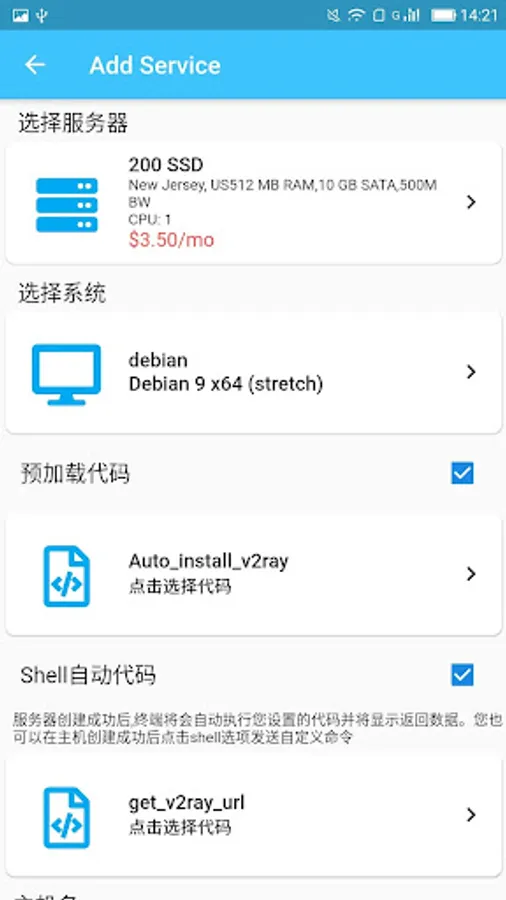 The pre-loading script uses "Auto_install_v2ray", and the post-loading script executes "get_v2ray_url" to obtain the configuration url of v2ray after the server is successfully created, and obtain the url through smart copy. Build as you go, destroy before bedtime, the only choice to save server funds!