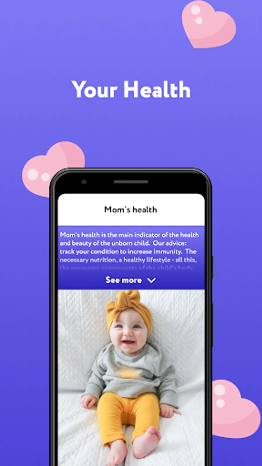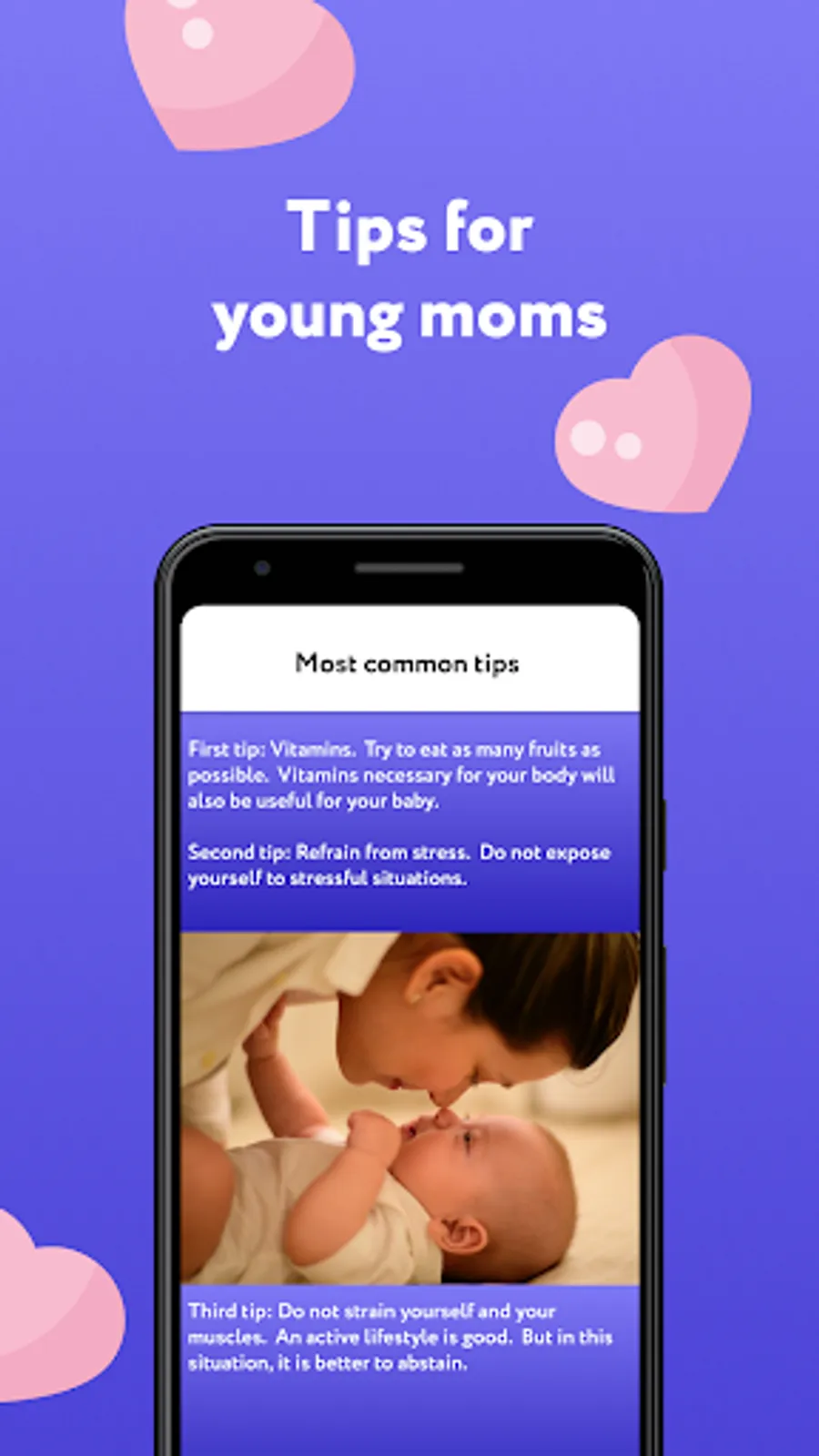 "Pregnancy, childbirth, child development" is one of the best apps for future mothers, with amazing functionalities and good interaction design. It provides detailed information about pregnancy including: how the pregnancy develops by the week, possible risks, pregnancy management, recommendations and advice to future mothers, the most important childbirth questions and the most accurate answers to them. Join our new childbirth calendar app, and get to know the most important thing about child development.