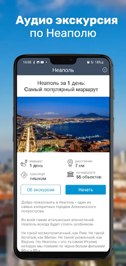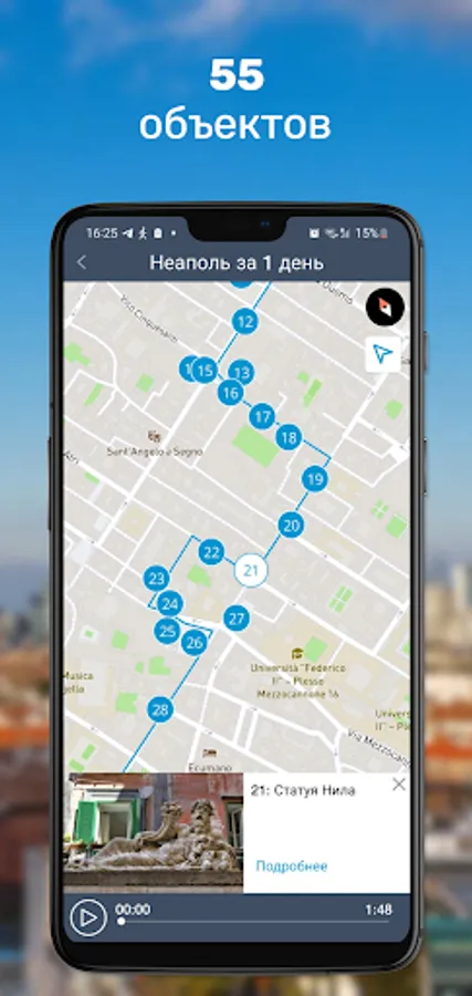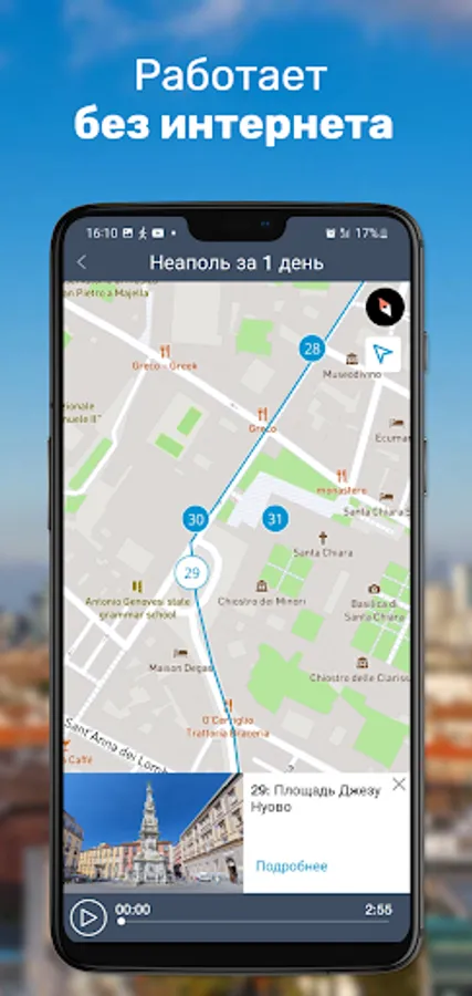 The audio guide does not consume mobile traffic in roaming and can work without an Internet connection, and the built-in GPS navigation will make it easy to find the right path in the maze of streets and squares of Naples, even if you are in the city for the first time.