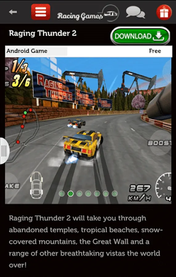 Most popular and new released racing games are available in this miscellany. Our editors expert in games have distinguished the high quality games from stuff games of the Android Marketâ„¢ to create an alternative way. YOU CANNOT PLAY THE GAMES ON THE GAME LIST. With 'install' button, you will be directed to the android market if you have internet connection.