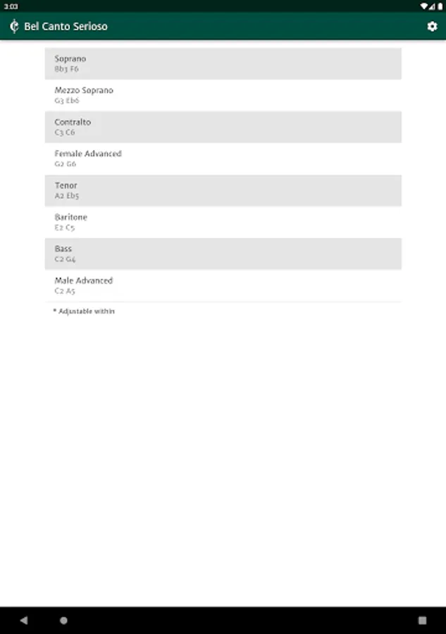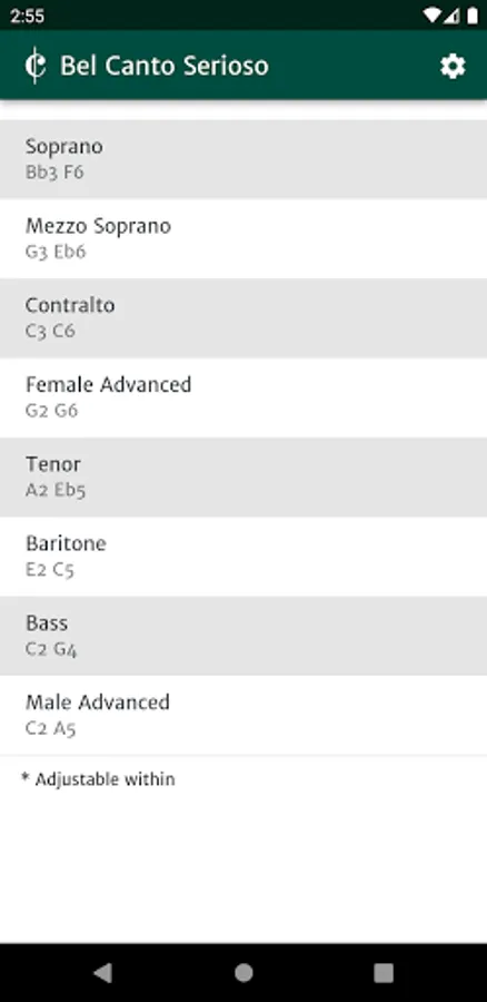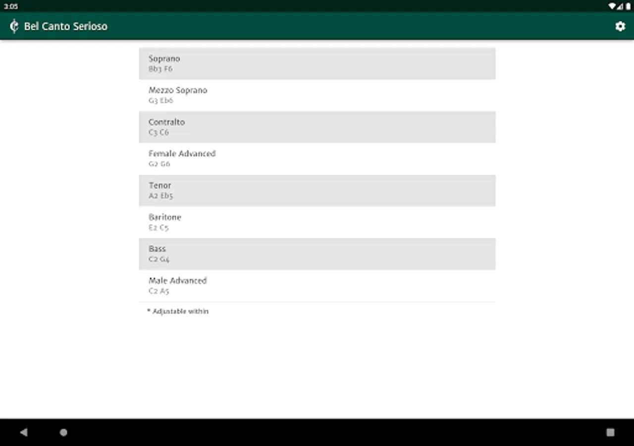 Exercise ranges can be set for a given voice classification. Female/Male Advanced section can be used if classified ranges are limiting.