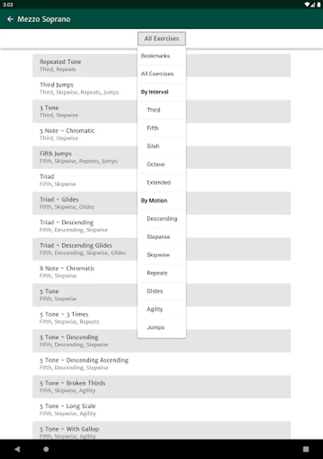 Exercises can be filtered by interval span: third, fifth, sixth... or by motion: descending, stepwise, skipwise, agility, glides, diatonic...