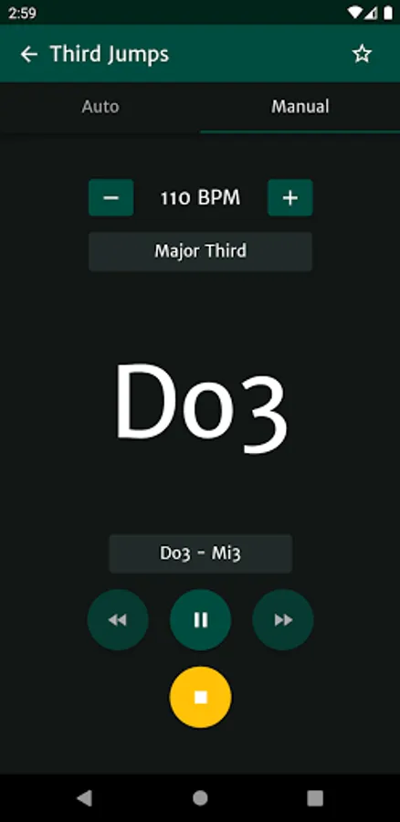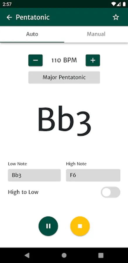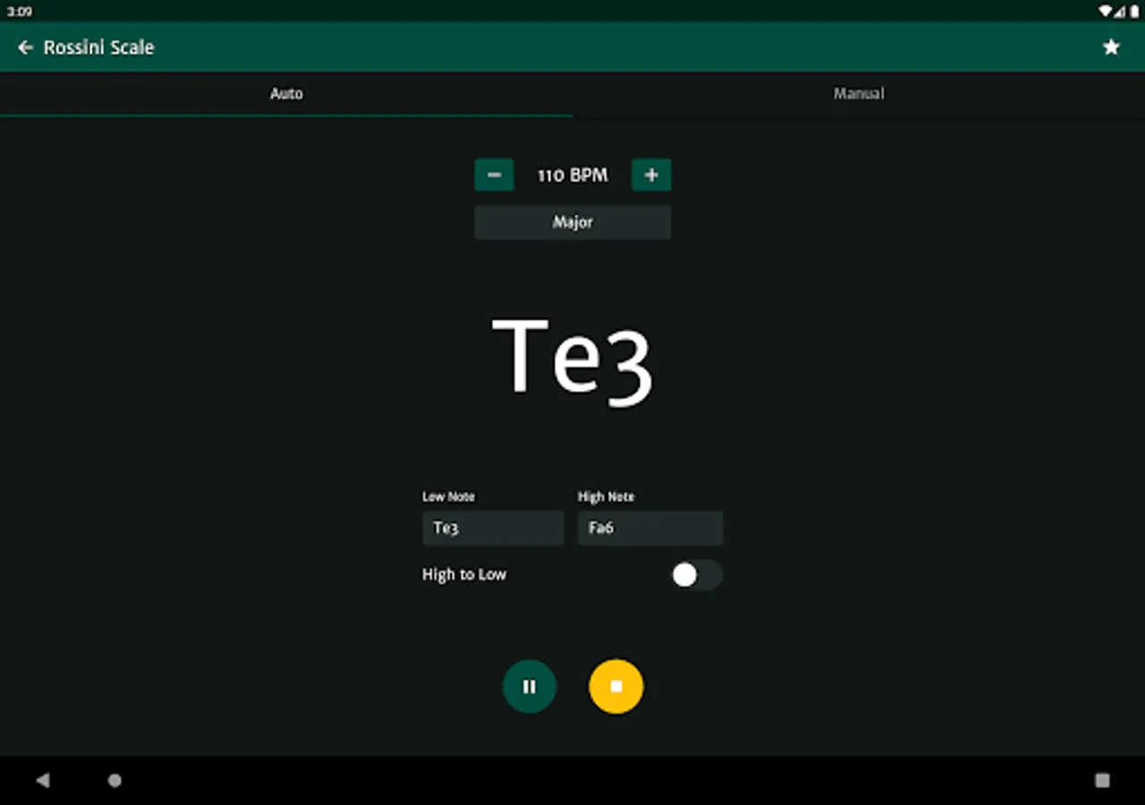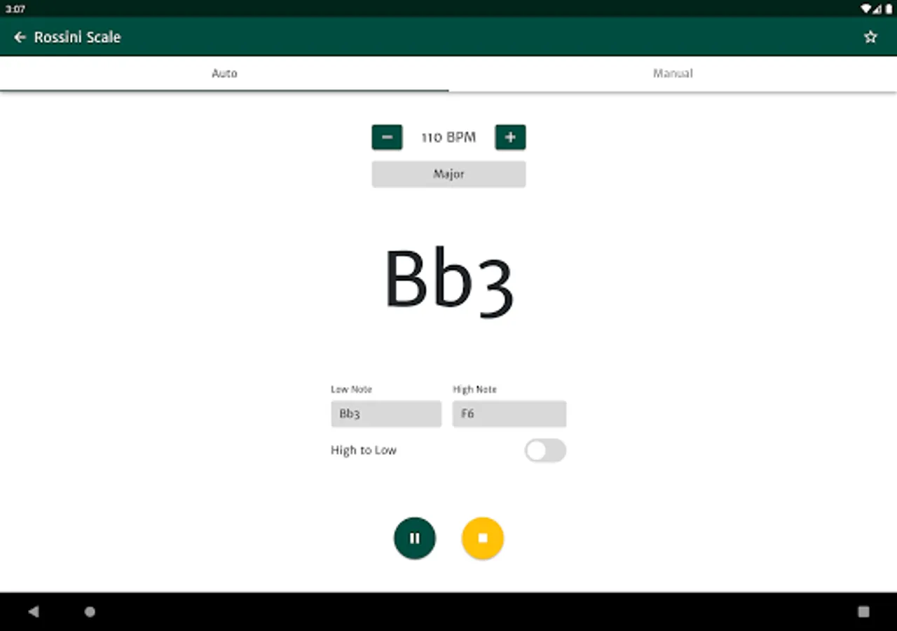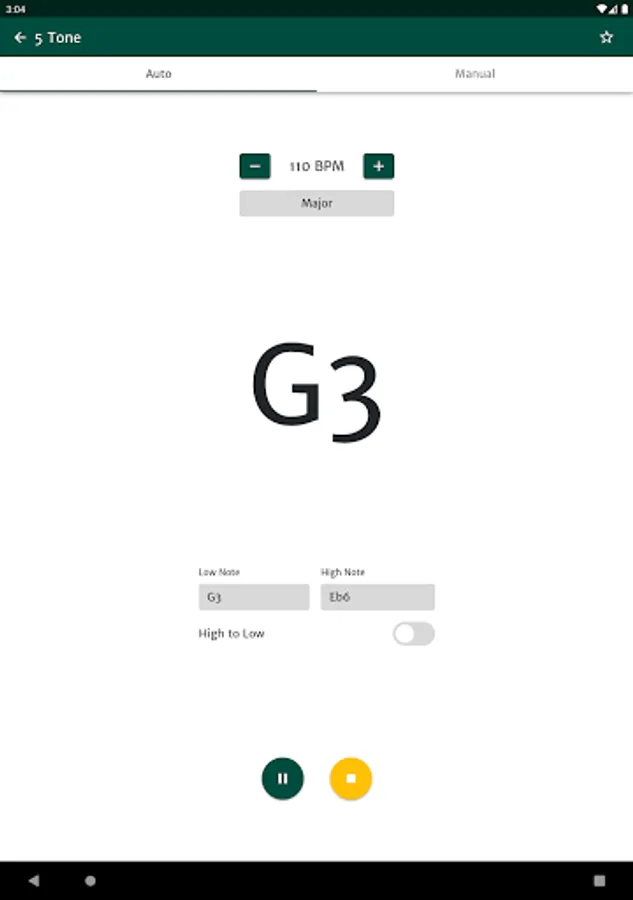 - In Manual mode the pattern/scale of the exercise can be advanced higher or lower manually. This is similar to practicing with an instrument, like playing