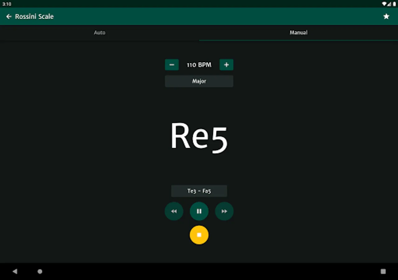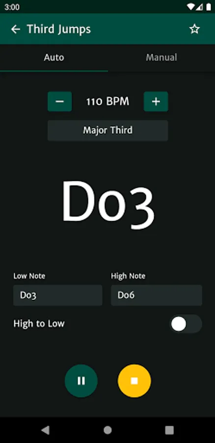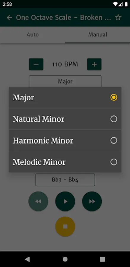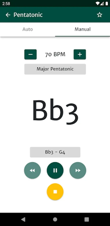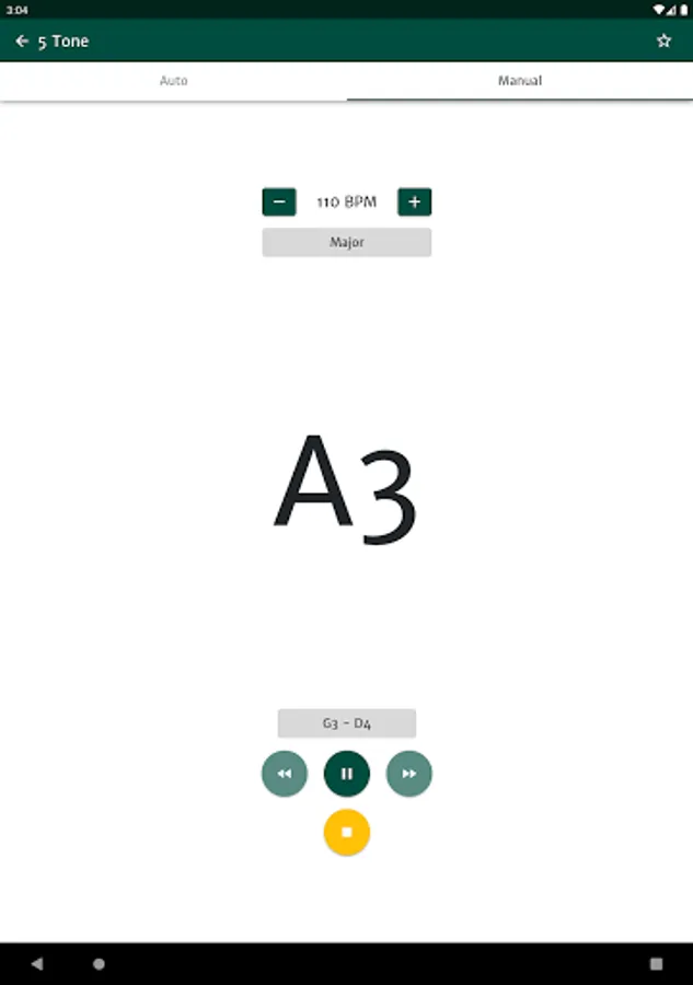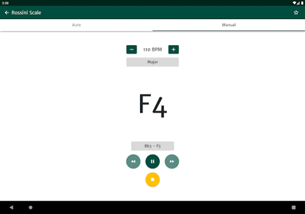 - In Manual mode the pattern/scale of the exercise can be advanced higher or lower manually. This is similar to practicing with an instrument, like playing
