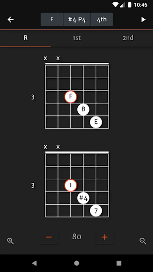 The play button plays the inversions in succession - in a loop with a metronome beat - and switches the tabs/inversions accordingly so that you can practice along the app. In this mode you do not have to change the tabs/inversions manually.