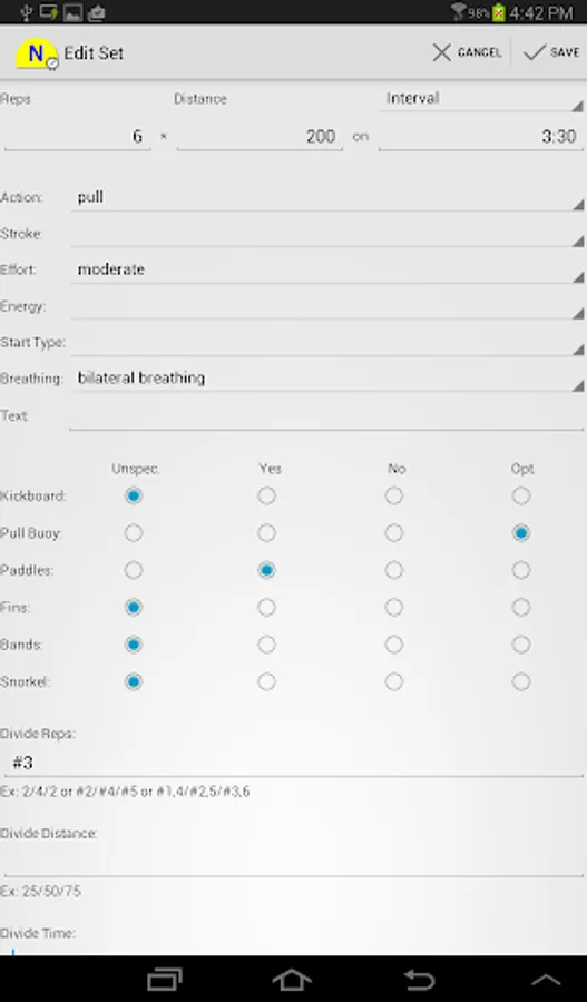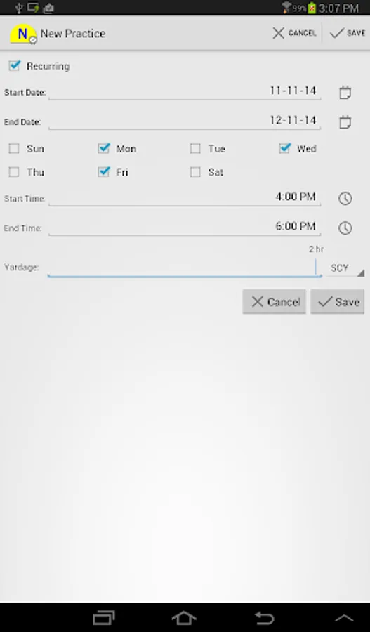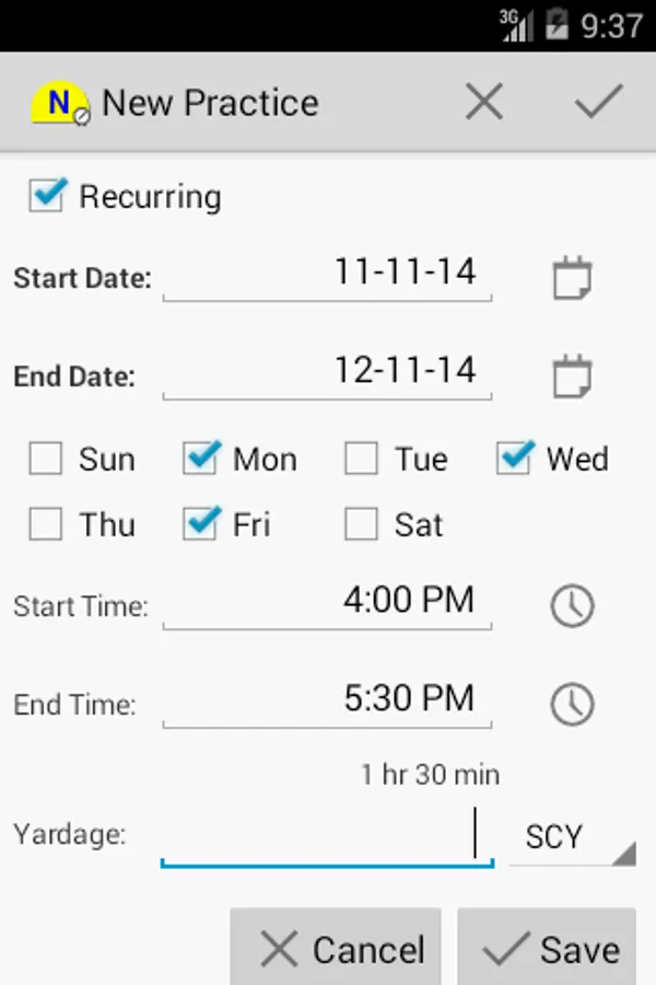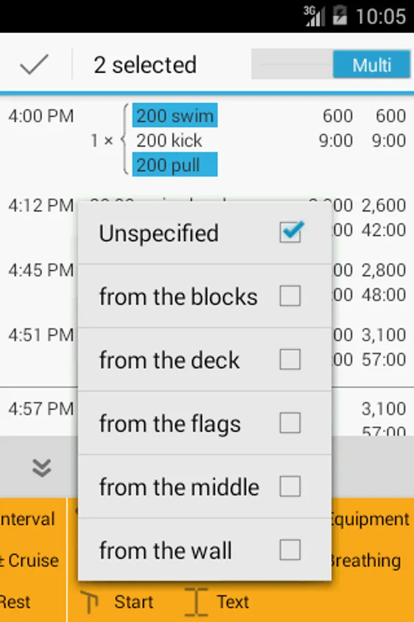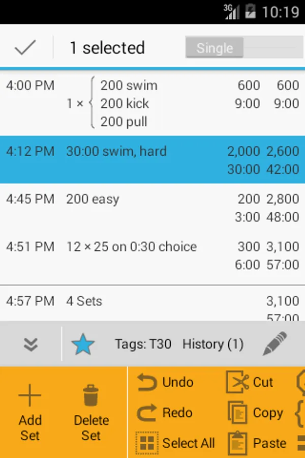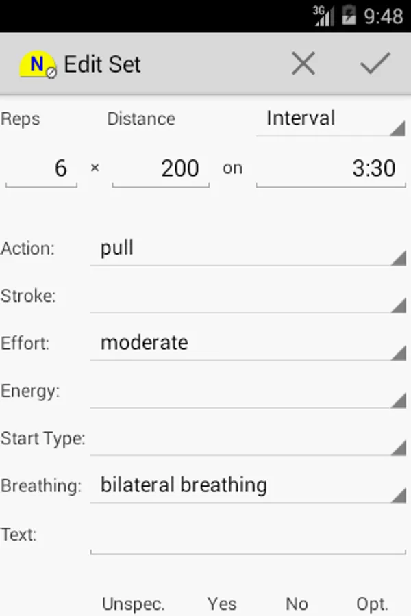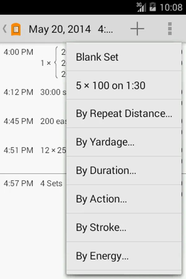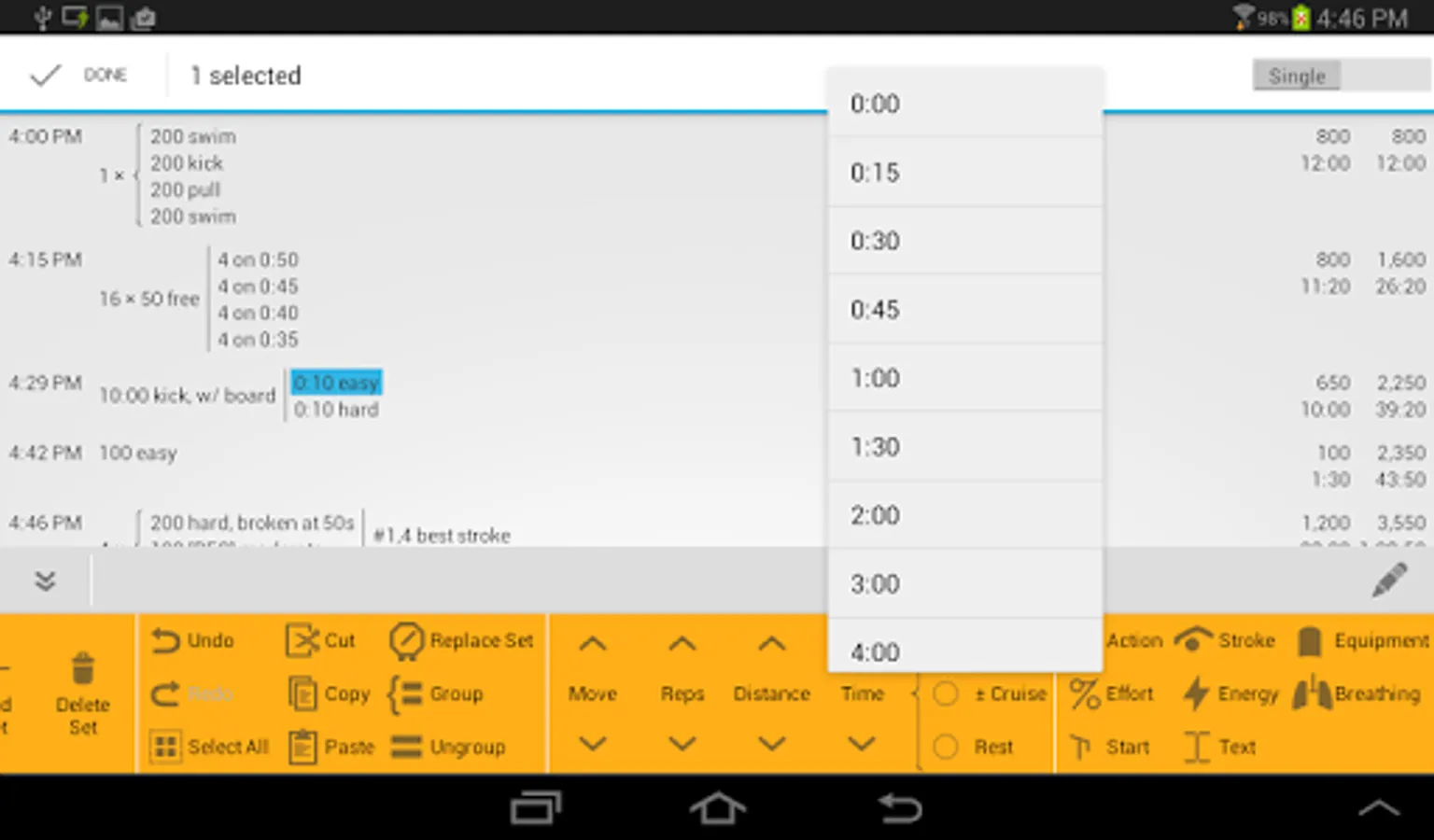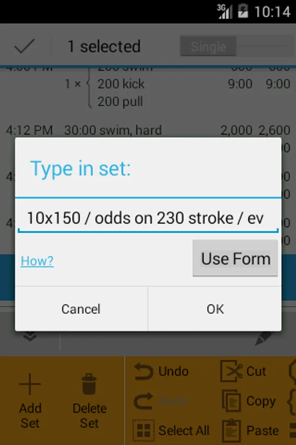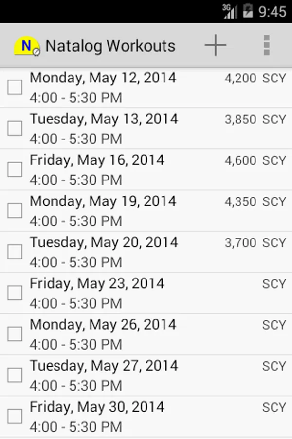 With the app, you could, for example, record that on Saturday, October 25, 2014 from 9:00 to 10:00 AM you swam 3,000 yards, consisting of