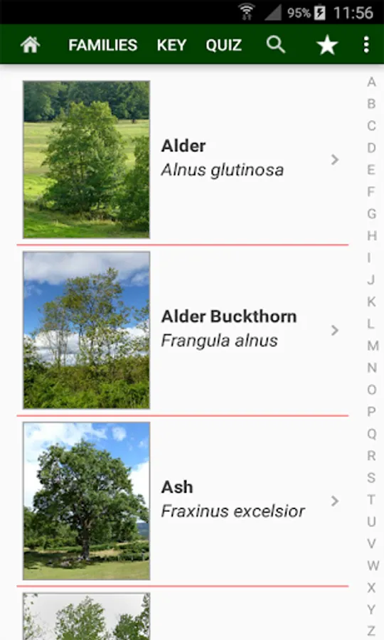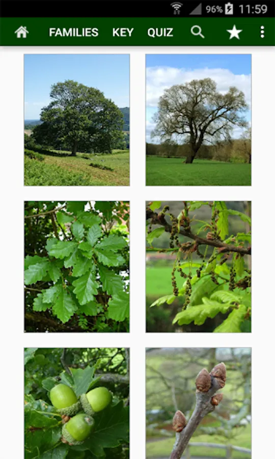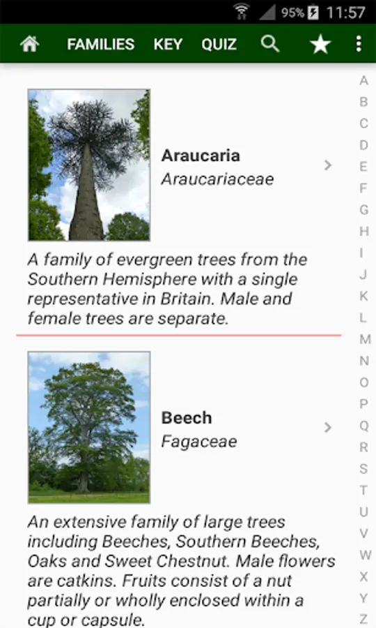 Trees are listed alphabetically and by Family. Each tree is presented with a description, botanical data, key identification points, cross-references to similar species, and a set of clickable thumbnails showing various aspects of the species.