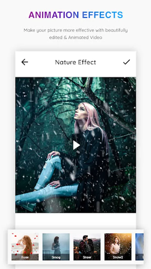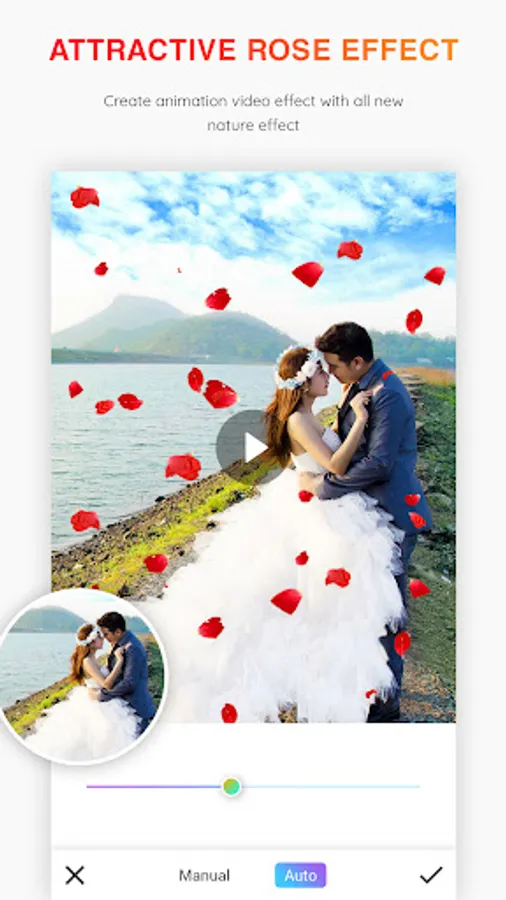 You can easily create for your photos many beautiful and attractive live animated nature effects with petal shape, rose effects, live rain effect, snow effect. nature photo effect video maker as known as love effect video maker have reach set of love themes and many nature effect to apply on photos to create video from images.