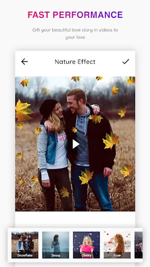 Thinking of giving your photo a effect with different and beautiful nature effect or love, rain, snow effects? Nature effect video maker app is a perfact video maker app to make photo to video with heart effect, love effects, leaves falling, snowflake and many more live nature effects. You will look like a professional artist when using this app.