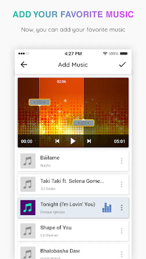 * Add music to your slideshow video. Select music from your SD card.