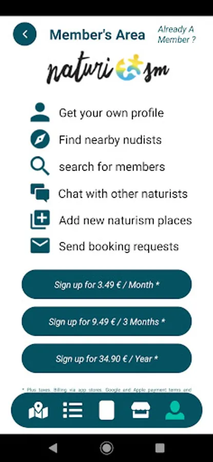 If you want more features and direct contact with other naturists, just become a member! Then you can create a personal profile, find other people with the same interests and chat. As a member, you also have the opportunity to write descriptions of naturist locations, rate them and even create new spots. You can also send booking requests to hotels and resorts to better plan your vacation. All for a small monthly fee.