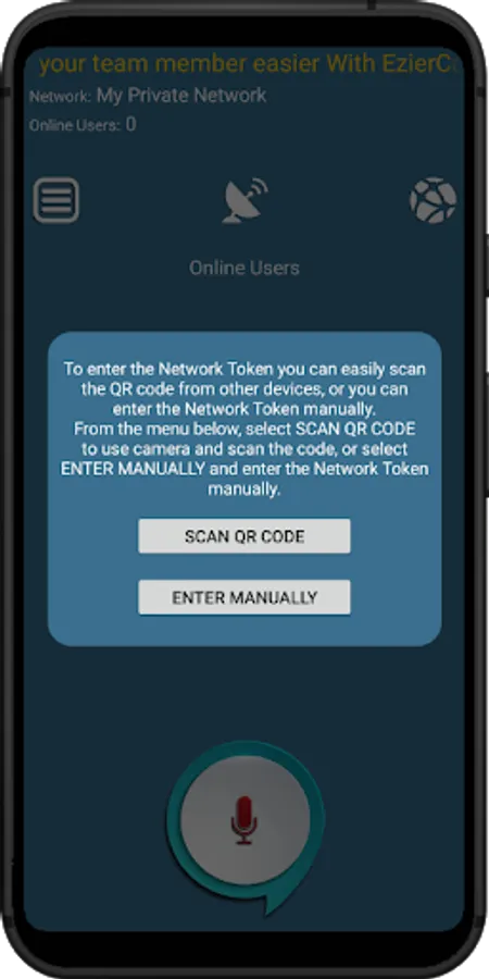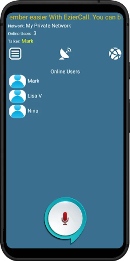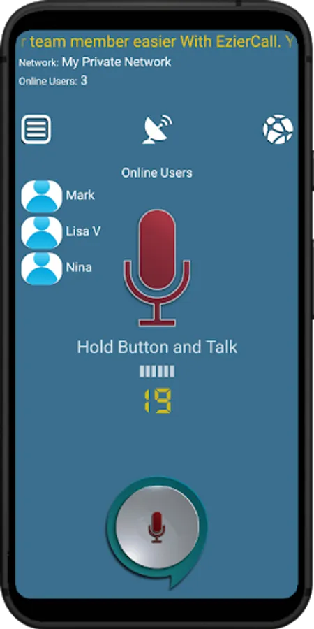 with eZierCall you create a private and secured network and share the network token with your friends or your team and ask them to join to your network. Then you can hold the PTT button and talk. All users on that network will hear you crystal clear. You can set the App to play voices without even taking the phone out of your pocket even when the App is closed and screen is off!