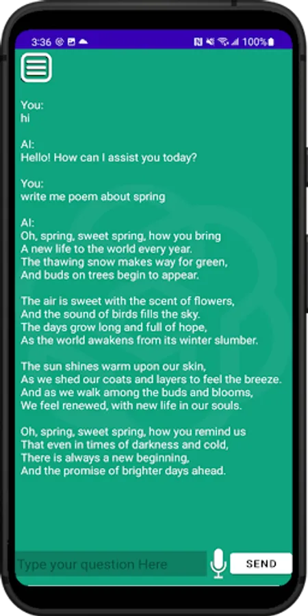 This App also uses Google's Speech-to-Text and Text-to-Speech features to make it easy for you to talk to Chat GPT. Simply click on the Microphone button, and talk to the bot. Your voice will be transcribed and send to the AI Bot and the response from the AI Bot will be automatically read for you so you don't have to type and read.