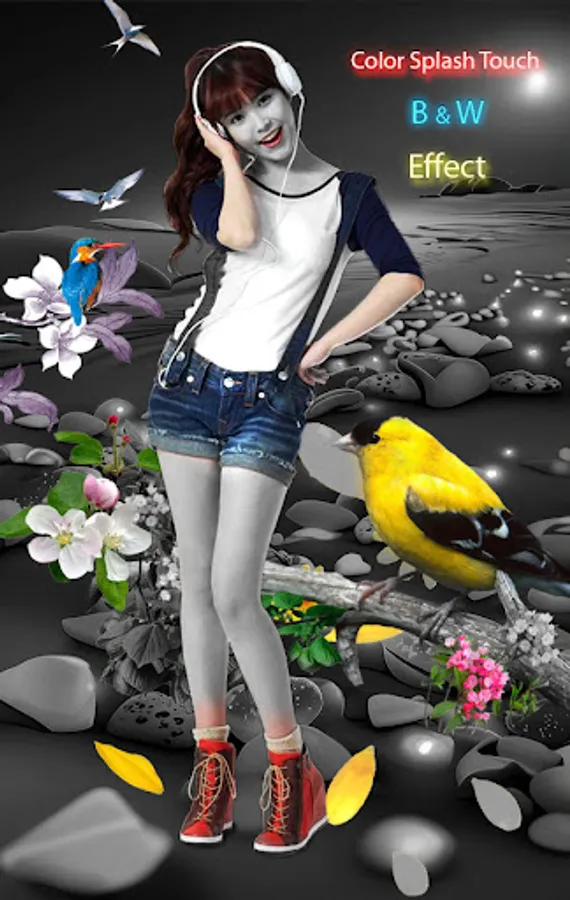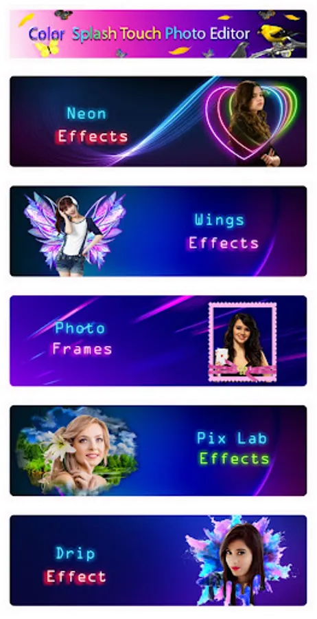 Color Touch Splash Photo Editor updated and includes with these effects PIX_LAB with Color Filter, B & W, Blur, Neon, Photo Frames, Wings, Drip, Photo Background Change, Motion Effect. We included 3D text stickers to decorate your pic.