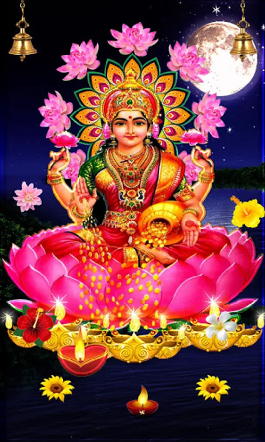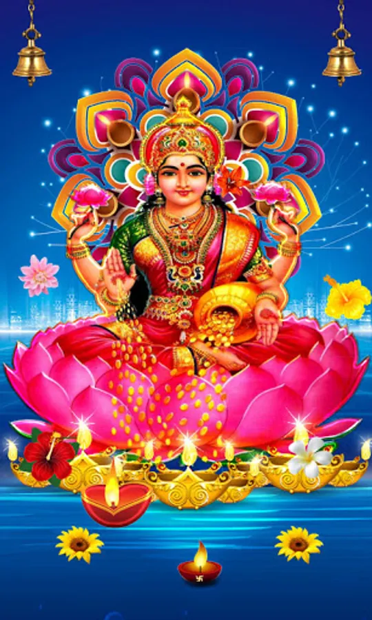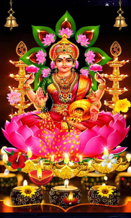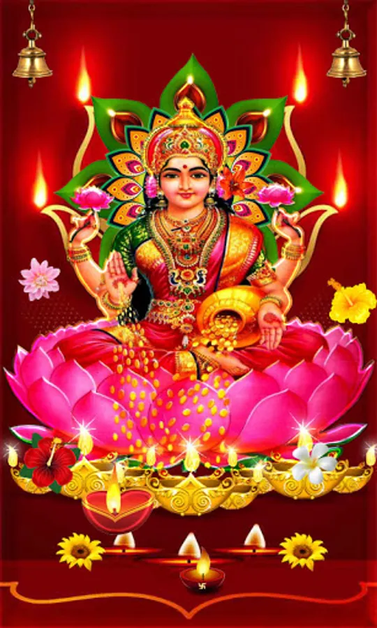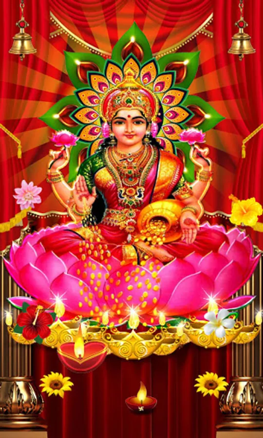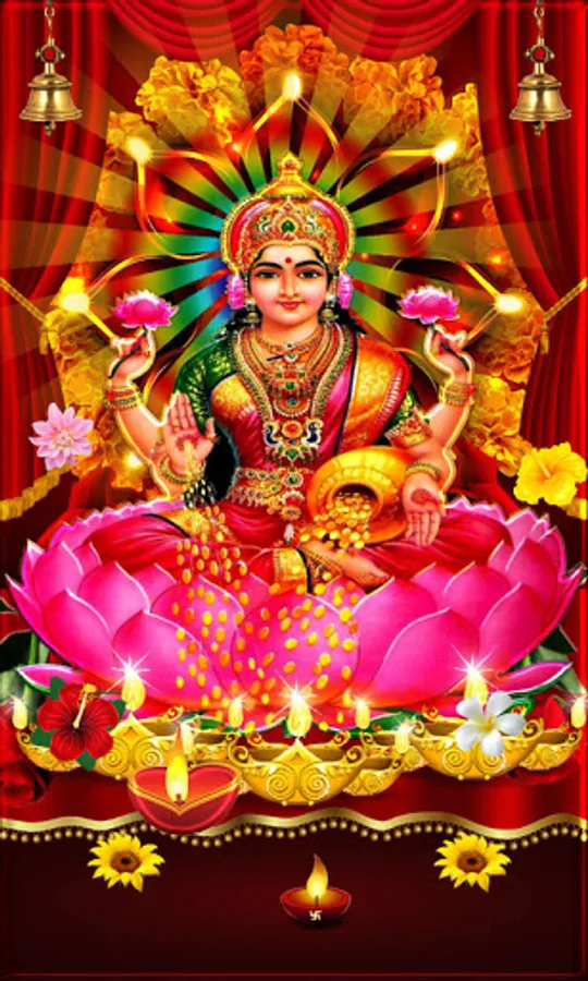 Lakshmi Devi Blessings Happy Diwali Theme Live Wallpaper with rays animation, bells, flowers, Deepavali & leafs fall animation with magic touch & Maha Lakshmi Devi Temple Themes.