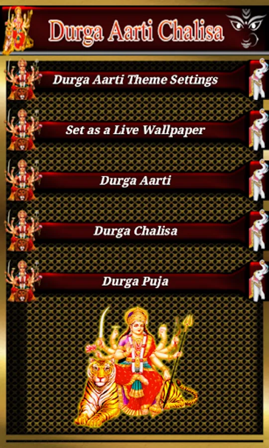 Durga Aarti & chalisa great live wallpaper & Durga Devi Aarati , Chalisa, Puja Process(Durga god Prayer) step by step for Mathras, Praarthana, Aarathi ,Chalisa description available in this application.