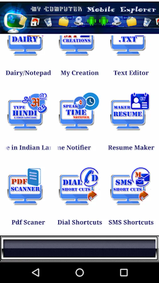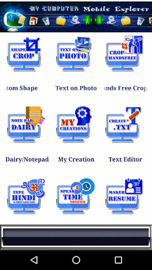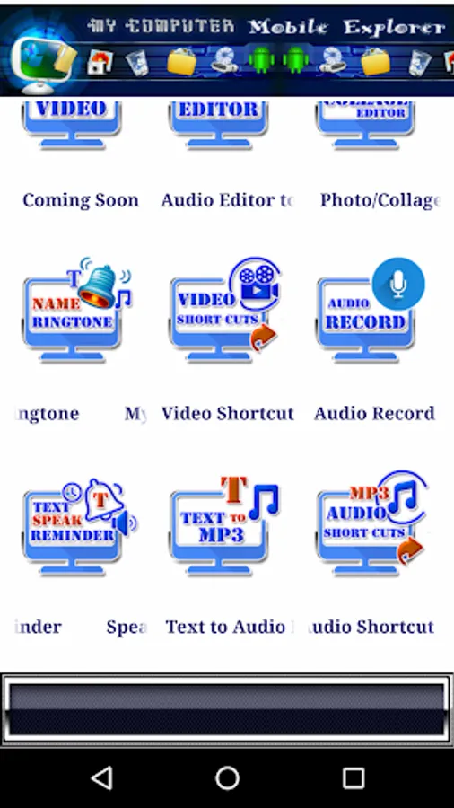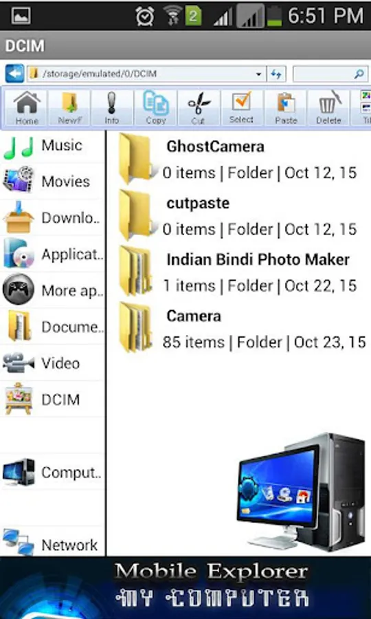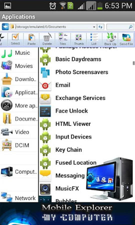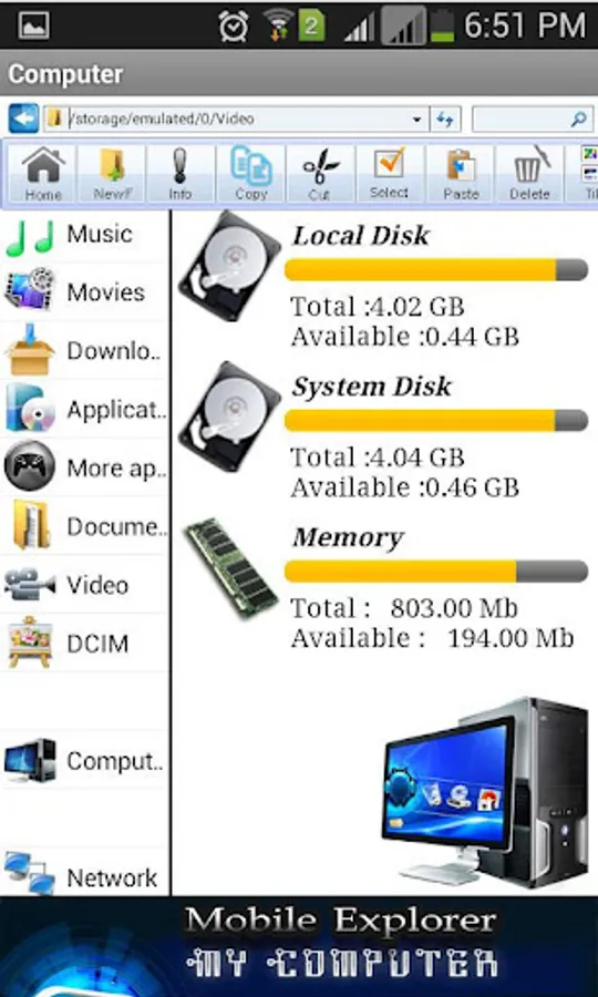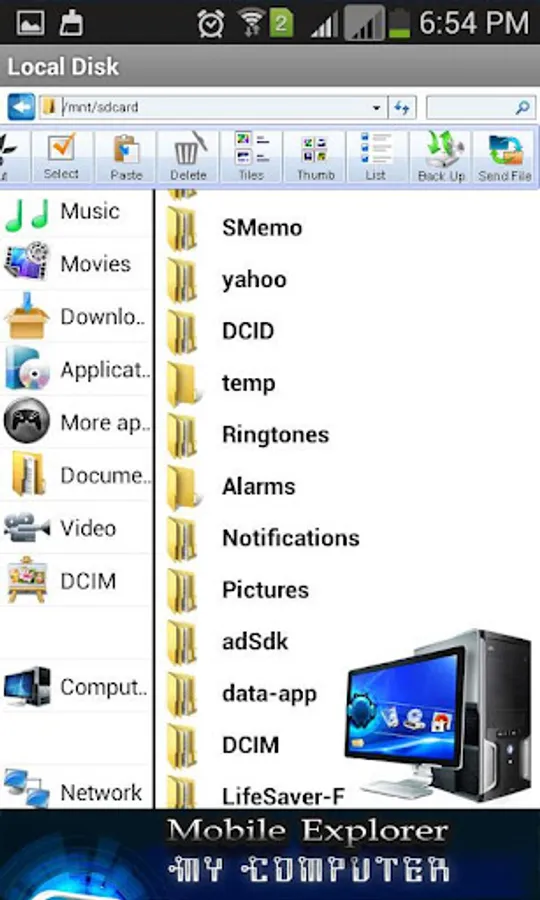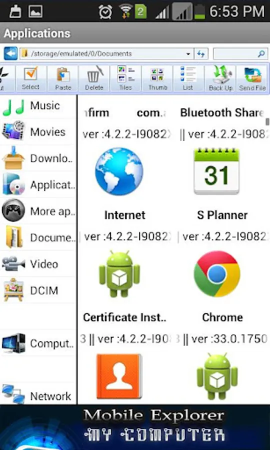 My Computer Theme Mobile File Explorer for your Mobiles.It's amazing feature like browse, cut, copy, paste, delete, send files.The File manger while browsing feels like your computer file explorer.You have an option for application manager and you can launch from this explorer,app search feature is there and also one touch to take all apps backup to the mobile.