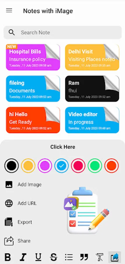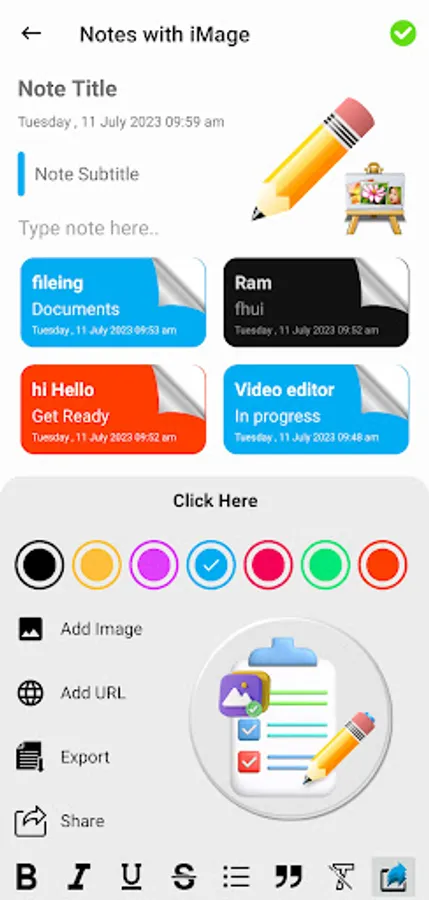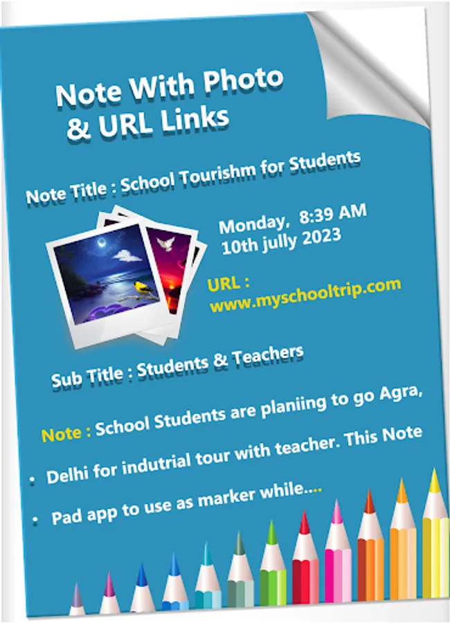 Note Pad App Make a Notes with Photo, add URL link as hyper link & add bullet option for text, text with bold, italic, under line and more text style for making notes.