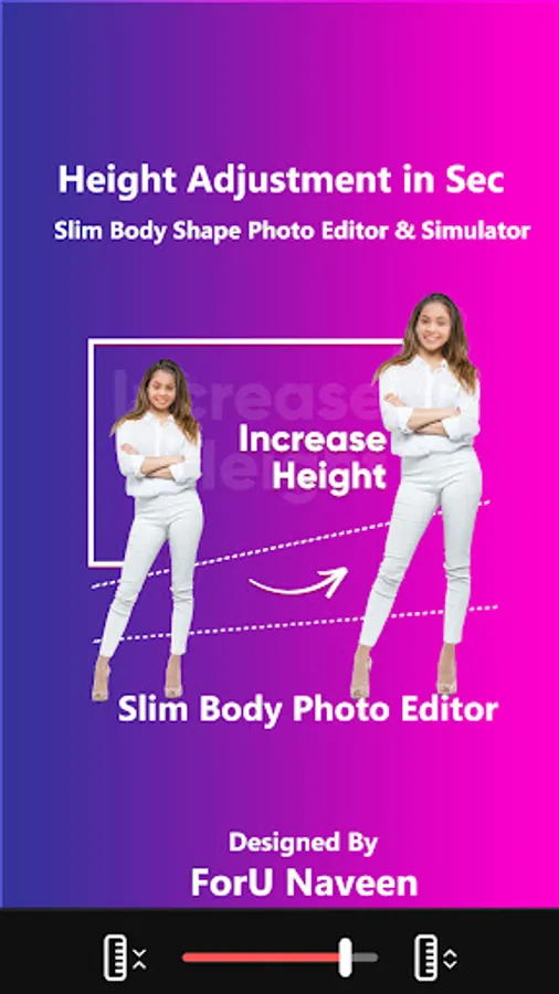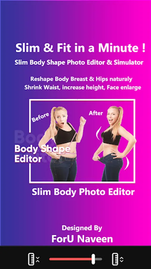 With Perfect Body shape Photo editor you can reshape body, Slim fit and face quickly, enlarge breasts and hips naturally, shrink waist, and even increase height. Also you can manege six-pack abs, chest, muscles, with tattoos stickers.