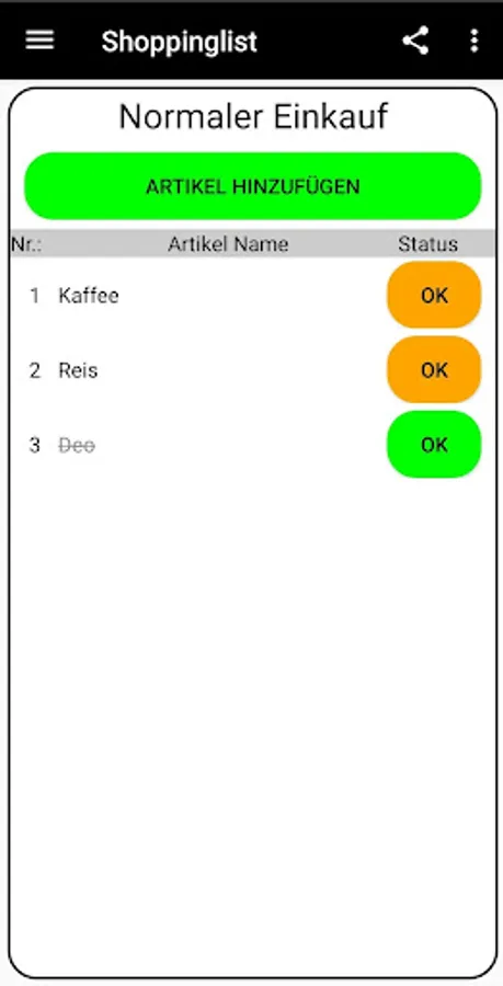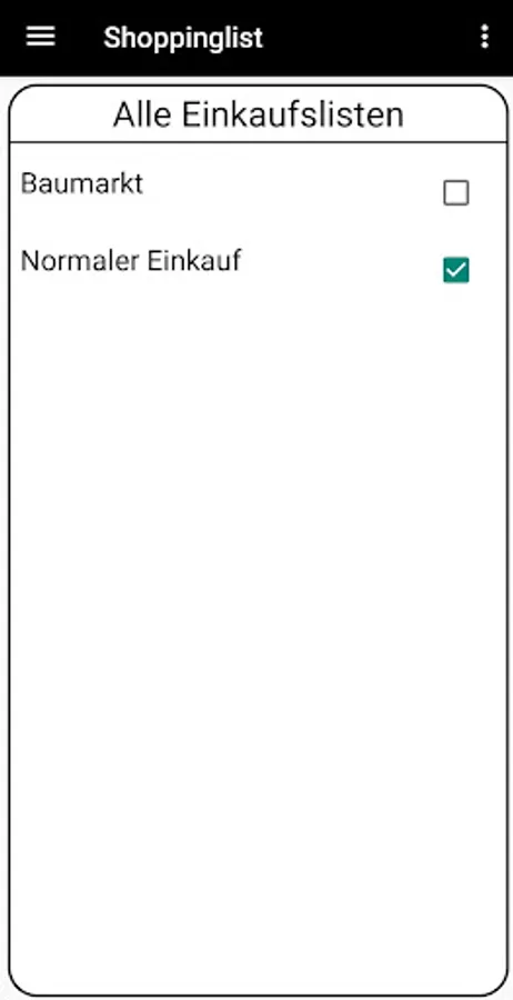 The app gives the user the opportunity to create a shopping list and edit it continuously. This should support the user and better organize the shopping, so that no article is forgotten to buy, since the smartphone is almost always there and it is not lost as quickly as a handwritten list.
