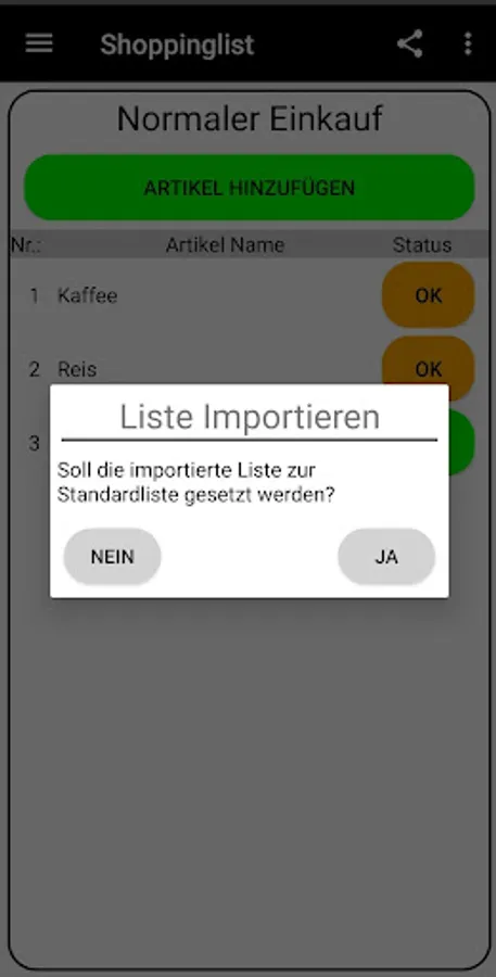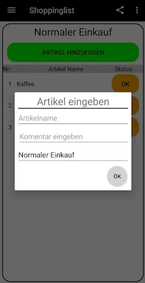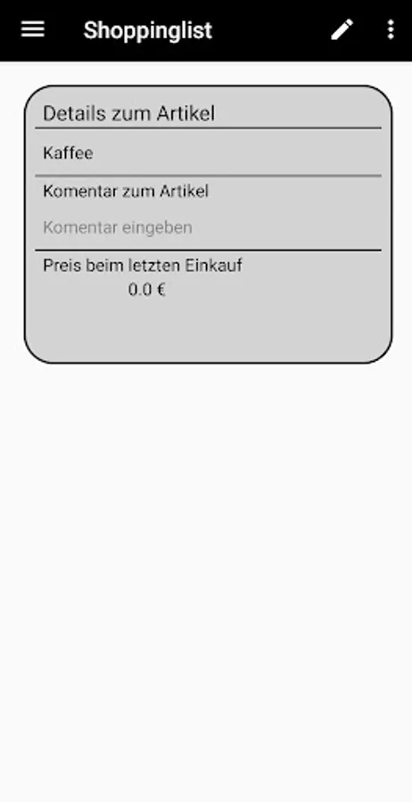 The app gives the user the opportunity to create a shopping list and edit it continuously. This should support the user and better organize the shopping, so that no article is forgotten to buy, since the smartphone is almost always there and it is not lost as quickly as a handwritten list.