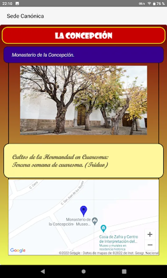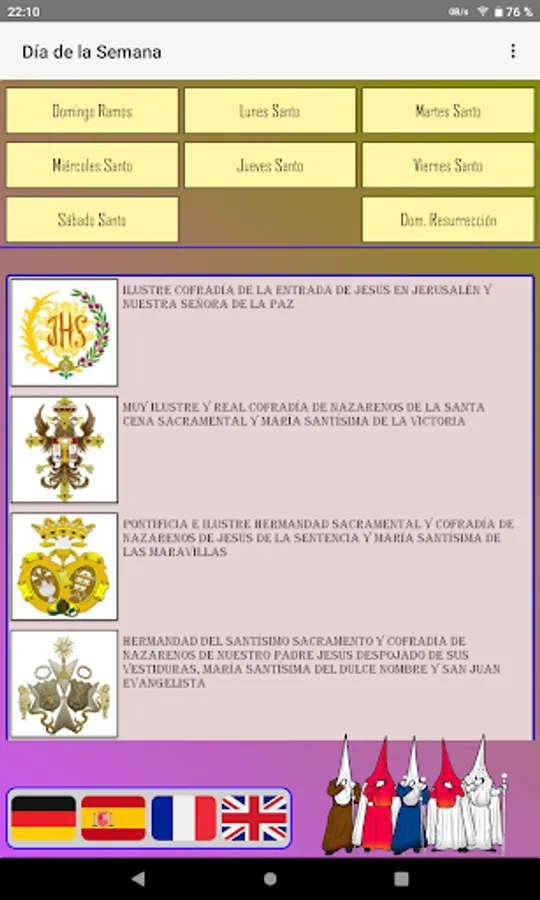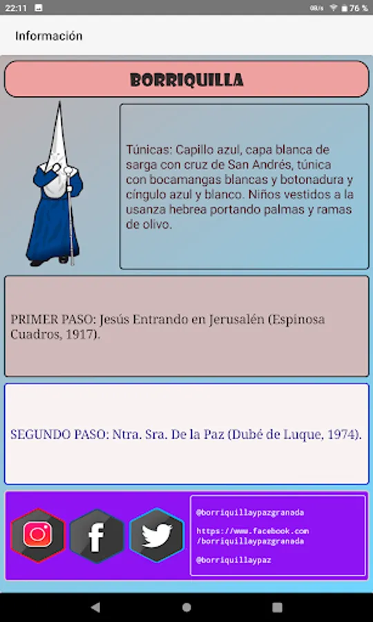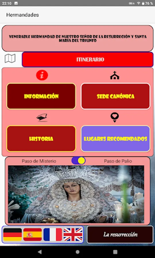 This application is a small guide to Holy Week in Granada. It contains photographs, data and itineraries of the 34 brotherhoods that carry out a penance station during Holy Week in Granada.