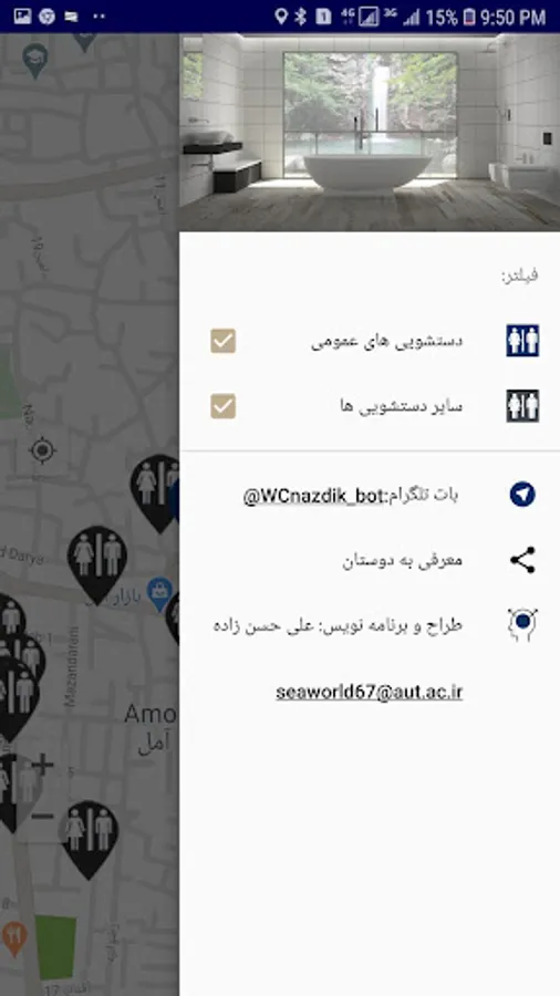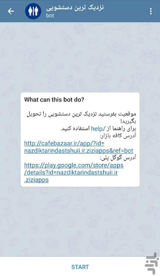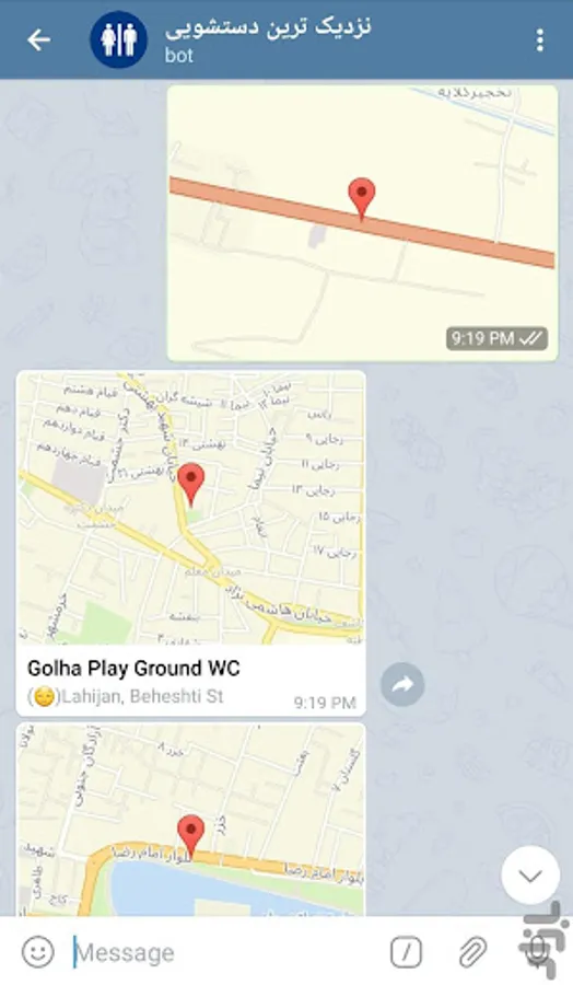 The app also has a bot telegram that shows the closest public toilet. The location you want to send to the bot will send you two public restrooms and one more restroom. This bot has a guide inside it too. This bot telegram address is closest to: