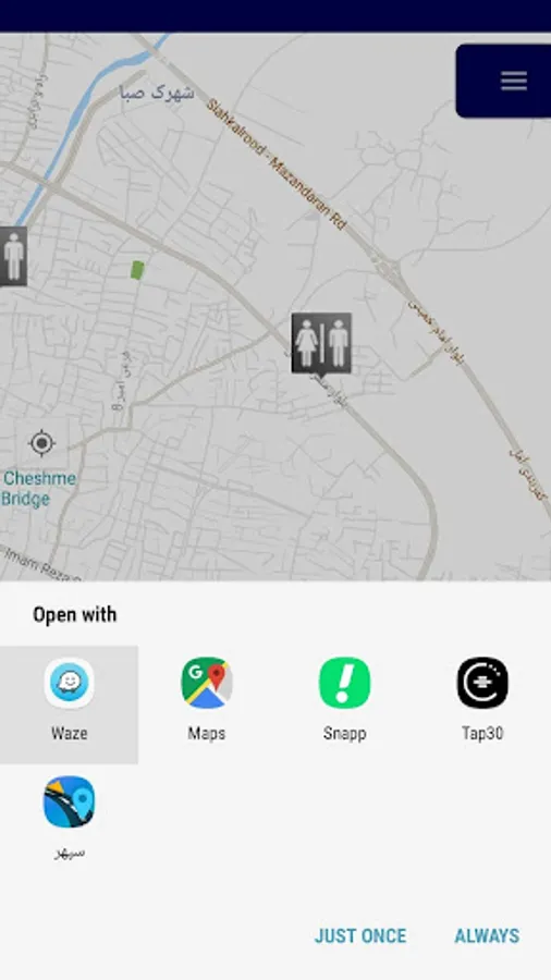 By clicking on any toilet you can find your way there with your favorite routing software. Just click the Route 1 button to select the route you want to display, like the last screenshot from the various routers you have installed.