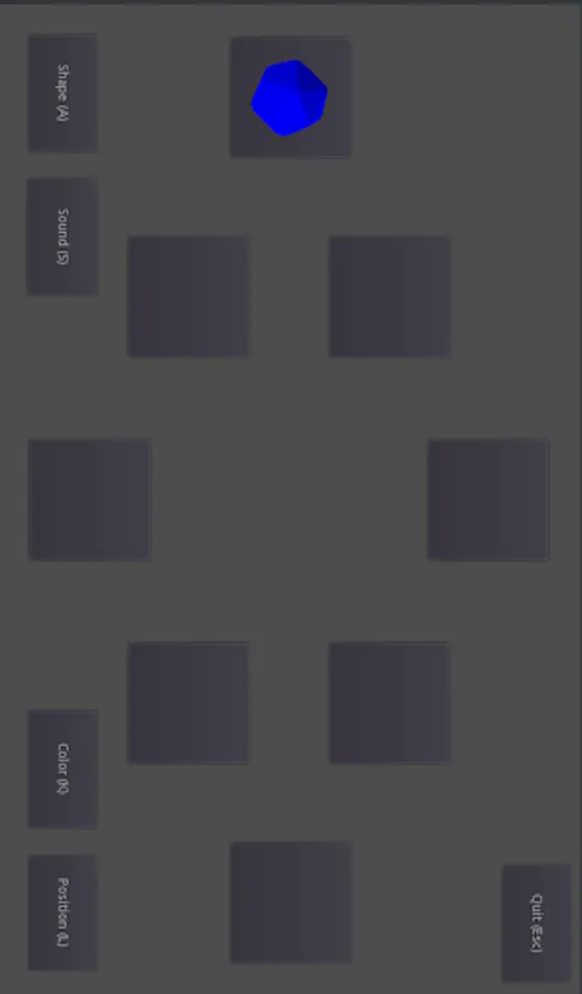 This N-back version uses 3D objects like dodecahedrons to represent the shape feature. The objects have a color feature and are shown in different locations on the screen. With each object representation a spoken letter will be follow.