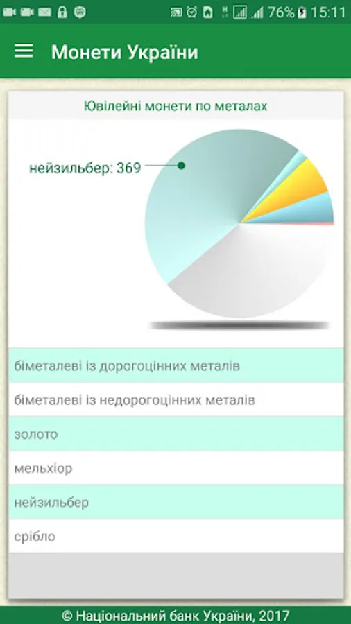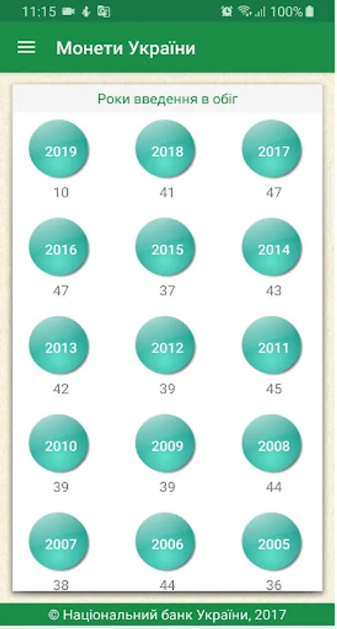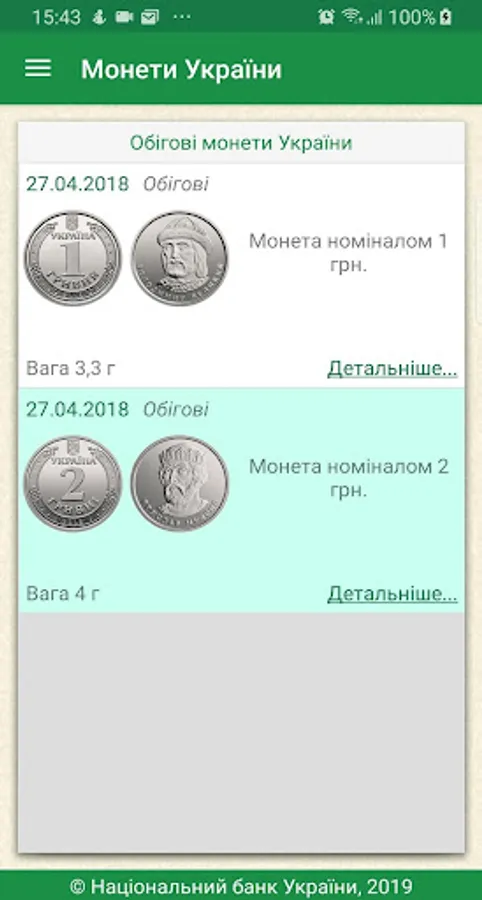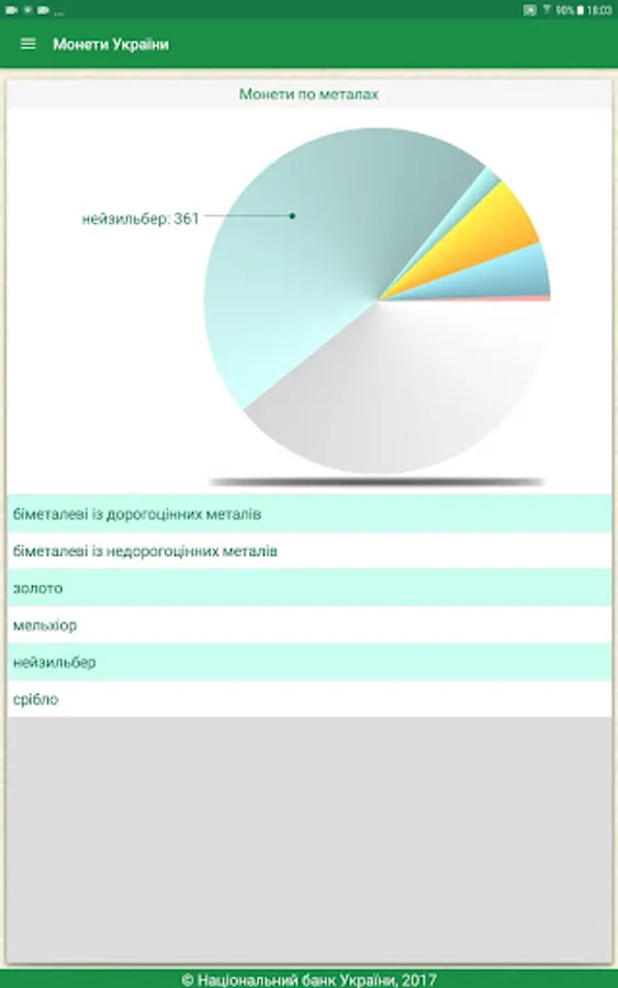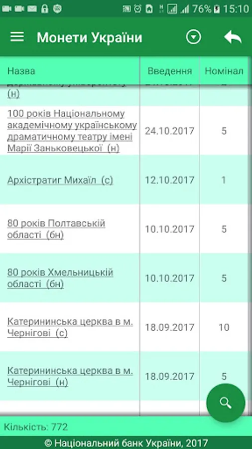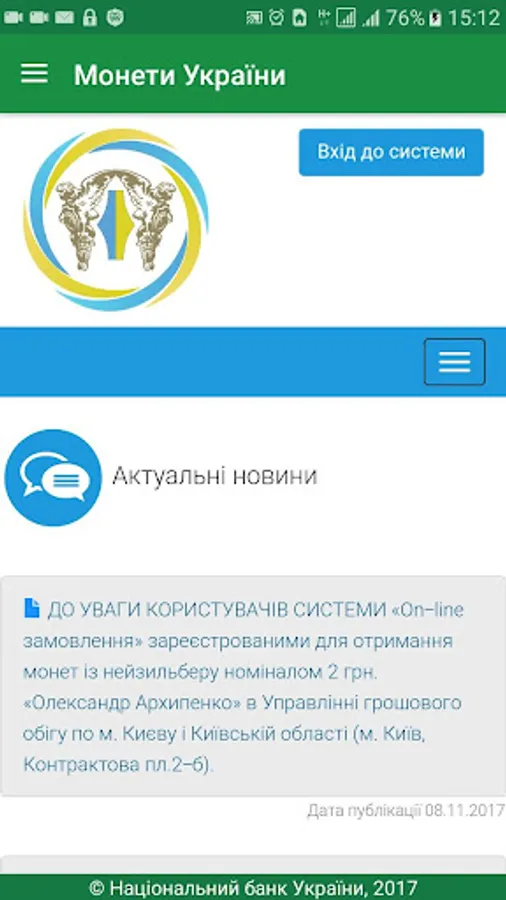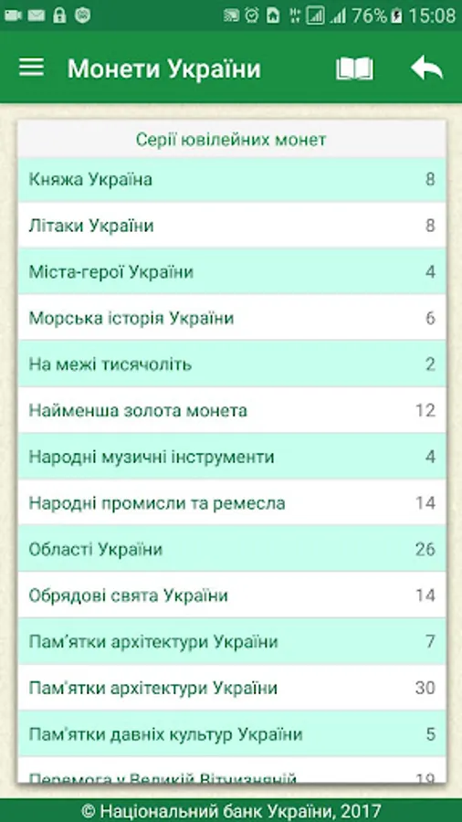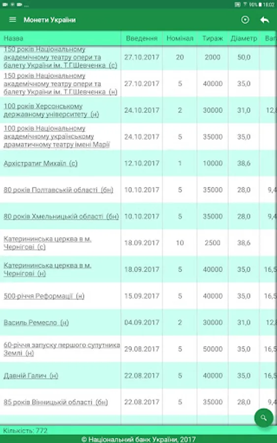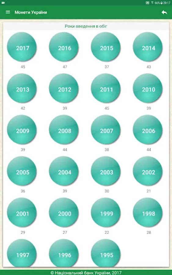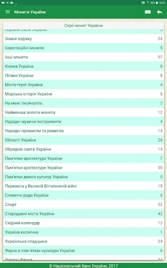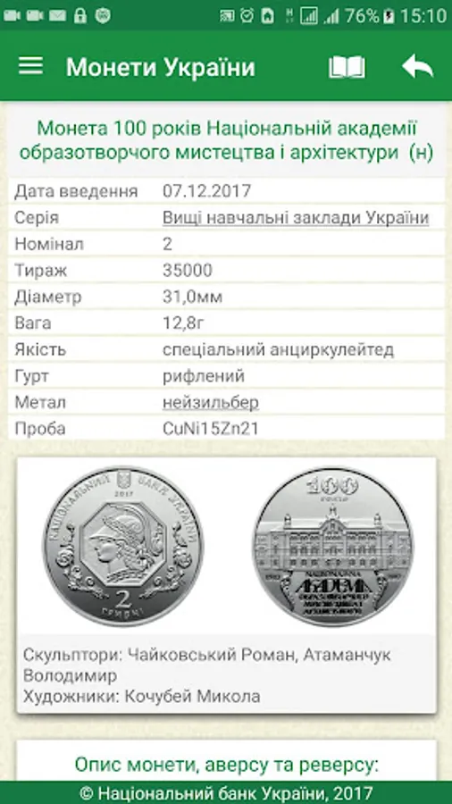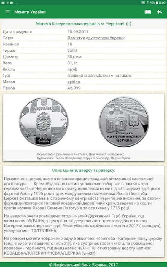 The user receives access to the complete directory Ukraine coins issued by the National Bank of Ukraine, the revision of technical information, images, descriptions and more. The annex is to search by title, series, and metal production year.