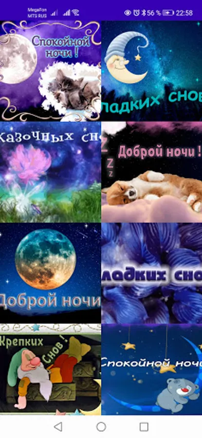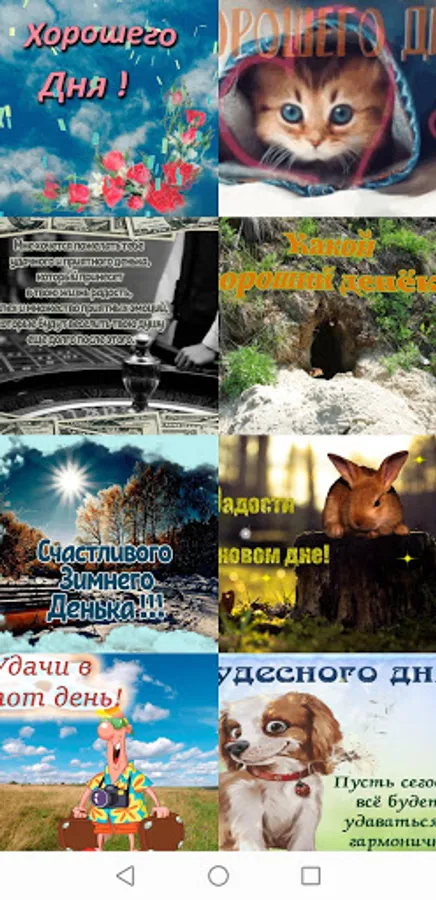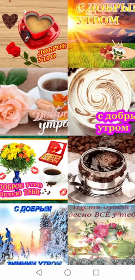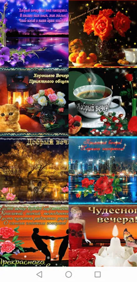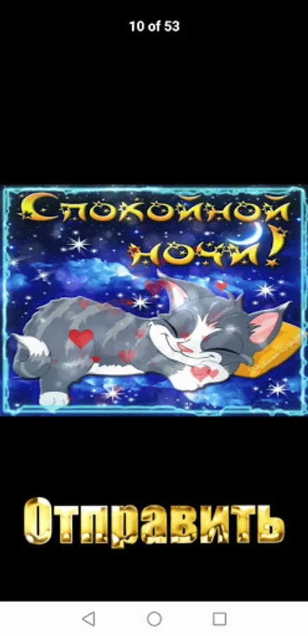 The app features animated gif greeting cards. With the help of our application, you can wish your family and friends good morning, good day, good evening or wish good night. A postcard with a wish can be sent to social networks and instant messengers that are installed on your device. All cards in the application are animated (flickering) in gif format.