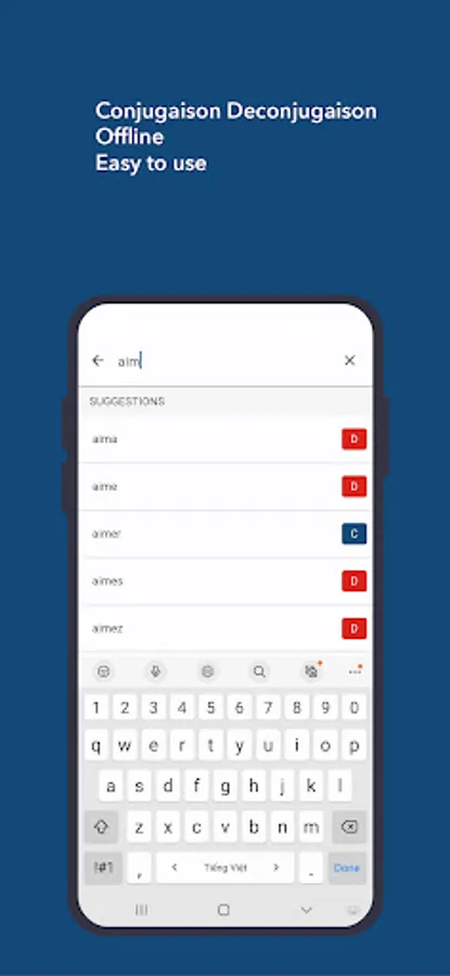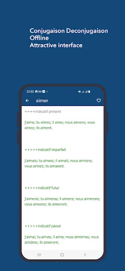 With more than 8000 Conjugaison and over 90.000 DeConjugaison words, this is the most sufficient free Conjugaison - DeConjugaison offline dictionary for android with words updated regularly in term of quantity of words and their meaning.