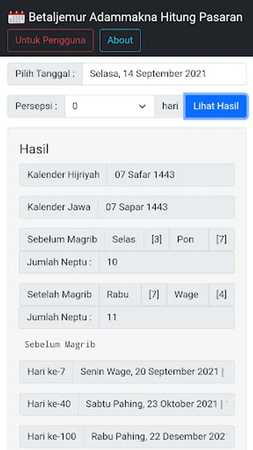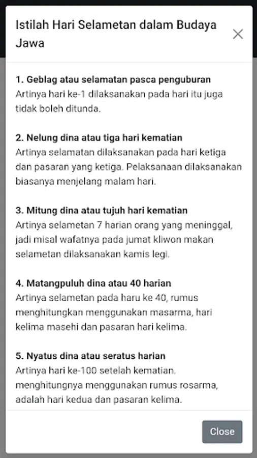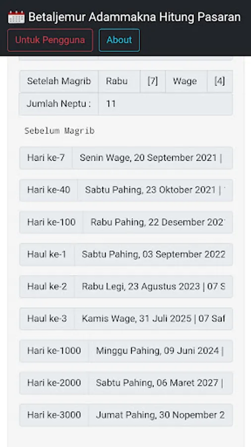 Quoted from the Book of Primbon Betalbas Adammakna Chapter Counting tahlilan / shukur (death memorial) according to Javanese calculations (Calculation Market) starting from the Day of Death, 7 days, 40 days, 100 days, haul to one, haul to two, and 1000 days.