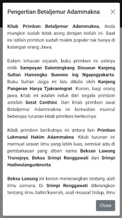 In historical trajectory, this primbon book originally belonged to Sampeyan Dalemingkang Sinuwun Kanjeng Sultan Hamengku Buwono ing Ngayogyakarta. The book of the Sultan of Jogja was then written by Kanjeng Pangeran Harya Tjakraningrat. It is said that, for the Javanese, this book is the mother of all primbon after Serat Centhini. From the book of the early primbon, Betalsun Adammakna, several later derivatives of the book of primbon emerged.
