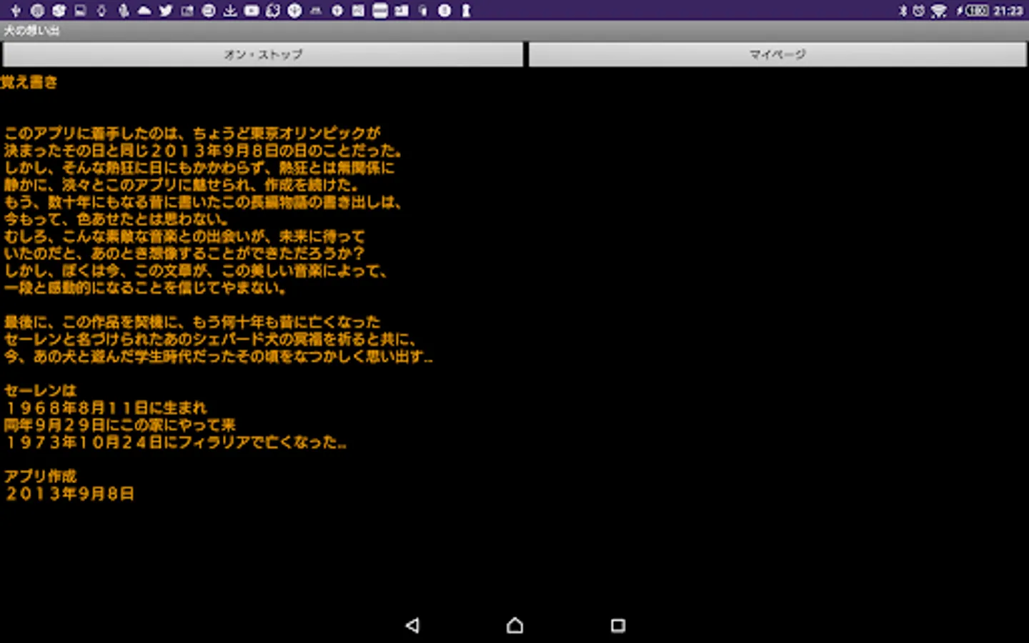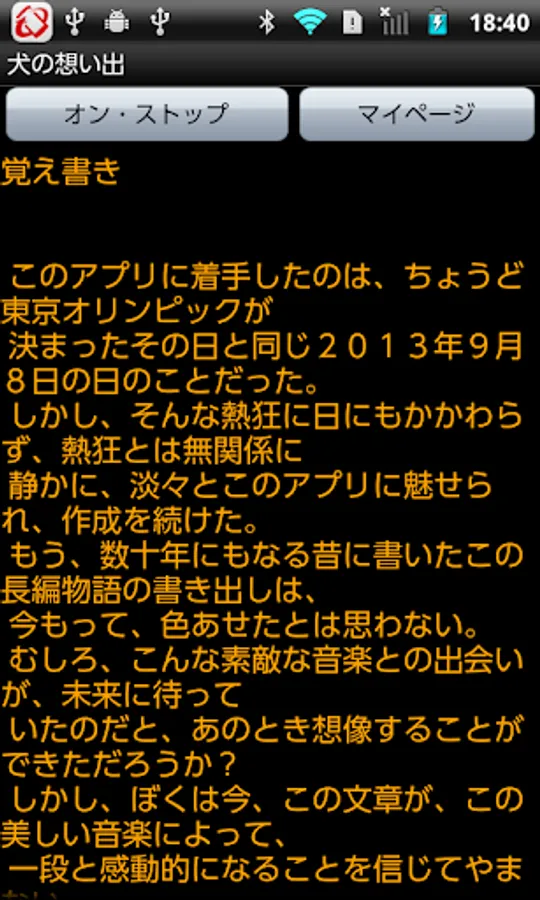 By pressing the stop button on the app, you can enjoy reading in a part of the beginning of the full-length novel. Reading until the start, it takes about 20 seconds after pressing the button, and part of the prologue might be a little boring, but you who had heard patiently, is a great experience from the first chapter of the second half I promise that. It should be noted that, in previous versions, in order to get a reading, download the app of N2 TTS, and I was in need of the pre-set, but the opportunity to change (2014/06/18) of N2 TTS of this time , I changed the specification is no longer used, so that the download of the N2 TTS. Therefore, the introduction of N2 TTS is not required for basically, just, specifications corresponding to N2 TTS only when reading the title that occurs at the start of this application Since all, for the person who wants to enjoy this application, including the there is, we do not reject the use of N2 TTS.