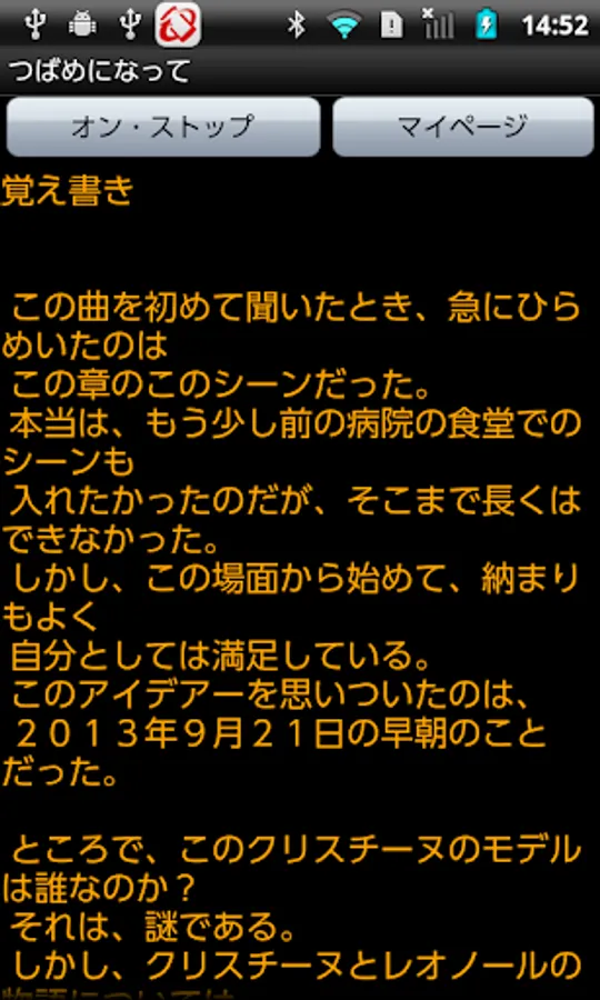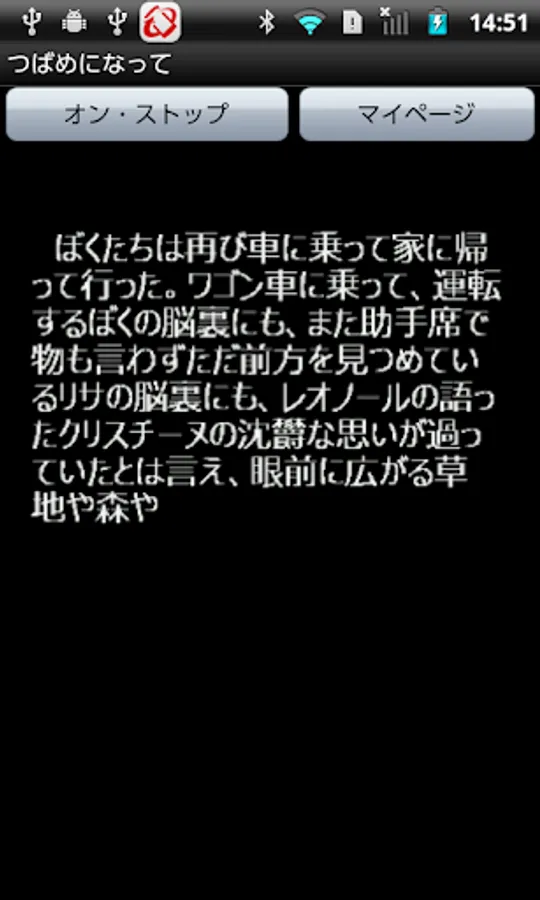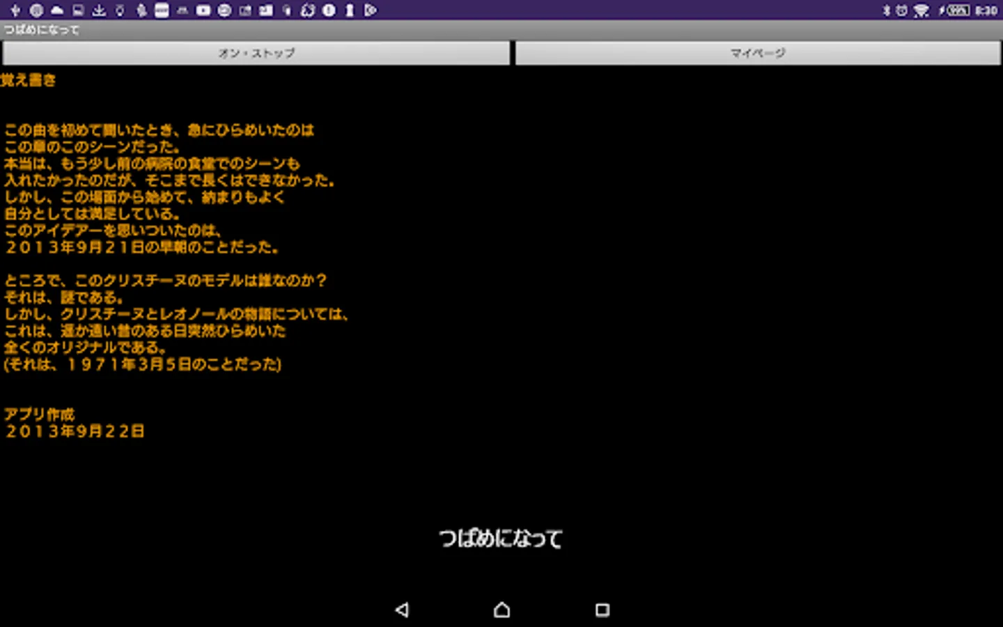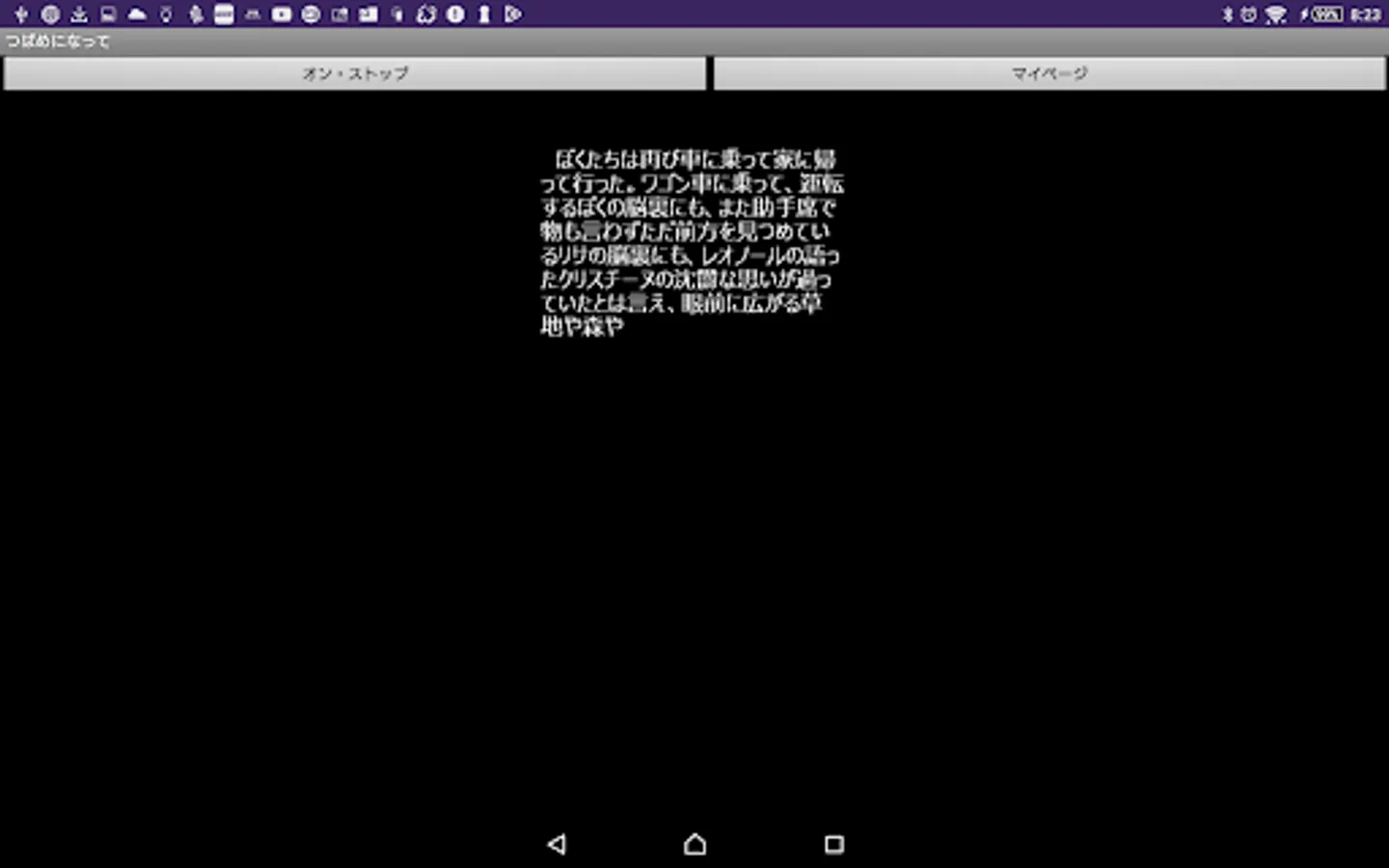 By pressing the stop button on the app, you can enjoy reading in the last part of the full-length novel. It should be noted that, in previous versions, in order to get a reading, download the app of N2 TTS, and I was in need of the pre-set, but the opportunity to change (2014/06/18) of N2 TTS of this time , I changed the specification is no longer used, so that the download of the N2 TTS. Therefore, the introduction of N2 TTS is not required for basically, just, specifications corresponding to N2 TTS only when reading the title that occurs at the start of this application Since all, for the person who wants to enjoy this application, including the there is, we do not reject the use of N2 TTS.
