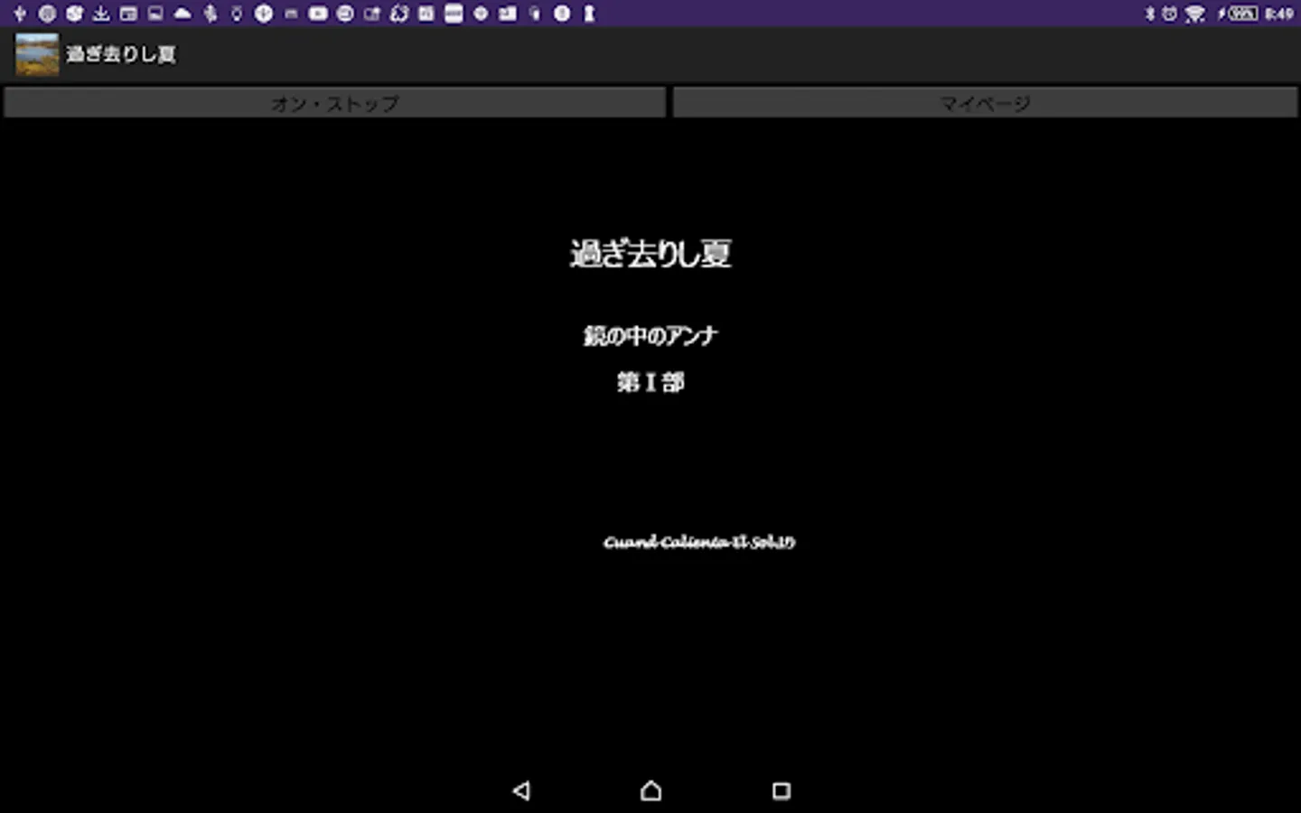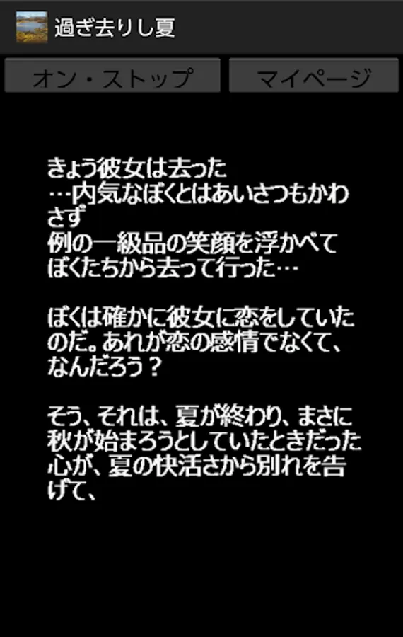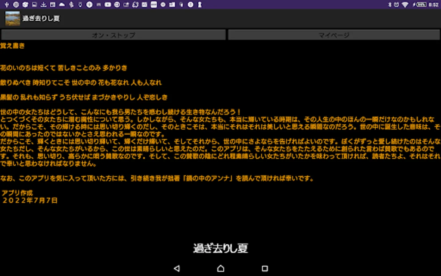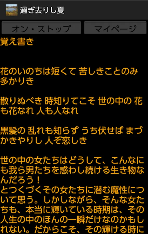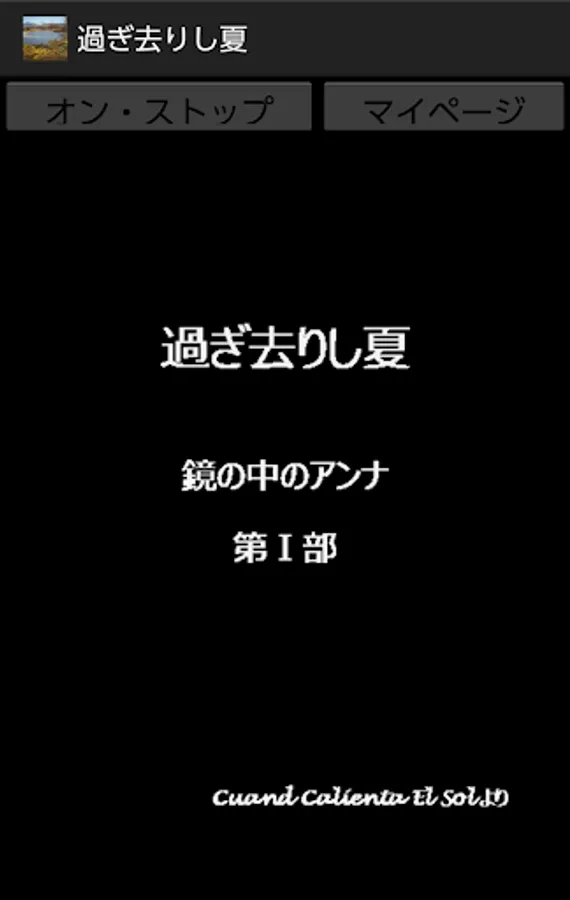 This app allows you to read the first part of my non-fiction-like novel by pressing the on / stop button. This application basically does not require the introduction of the reading application N2 TTS, but it is also a specification that supports N2 TTS only when the title that occurs when this application is started is read aloud, so I would like to enjoy the reading itself including that. For those who want to download the N2 TTS app.