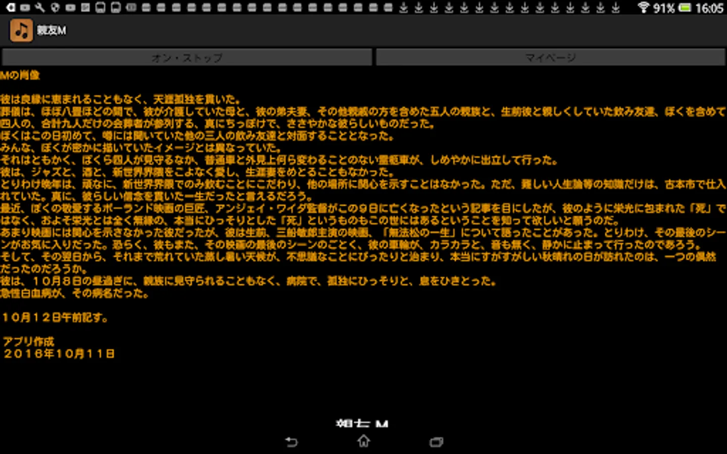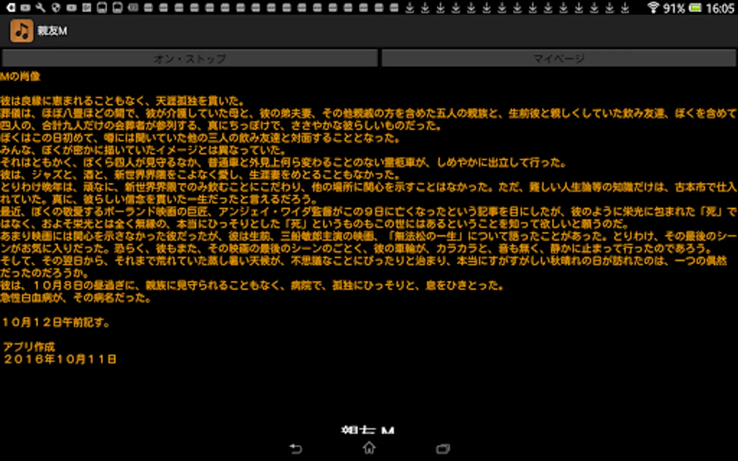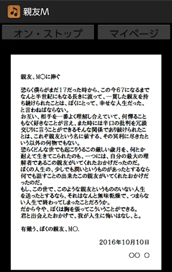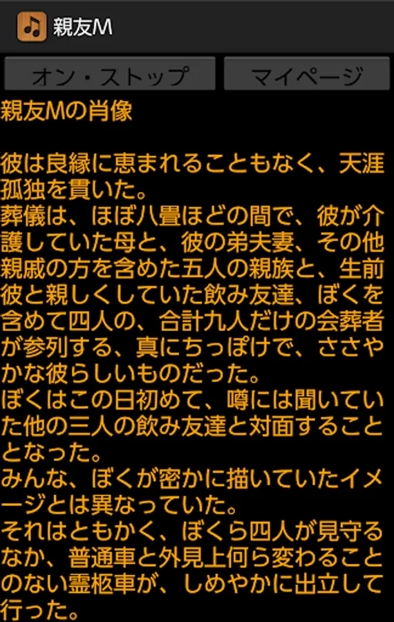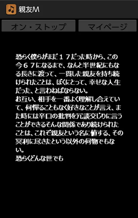 By pressing this application's On / Stop button, you can listen to memorial readings for best friend M who died just two years ago. Aside from music, this sentence was actually read out at the time of a funeral two years ago. Although this application basically does not require the introduction of reading application N2 TTS, it is only a specification corresponding to N2TTS only at the time of reading the title generated at the time of startup of this application, so I would like to enjoy reading reading body including it For those of you, download the application of N2 TTS.