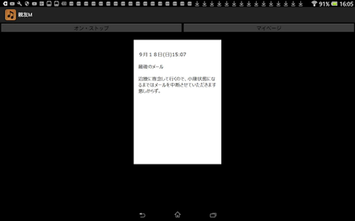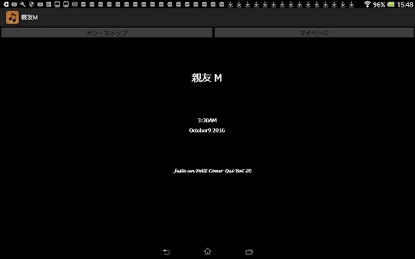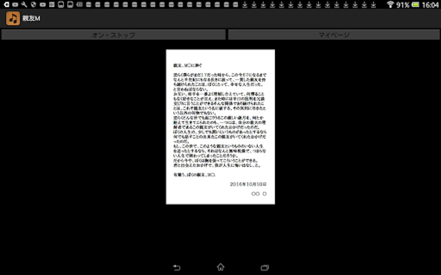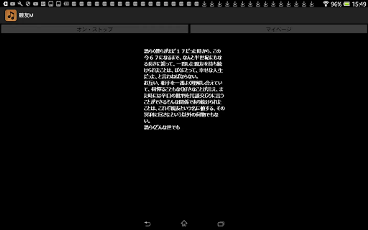 By pressing this application's On / Stop button, you can listen to memorial readings for best friend M who died just two years ago. Aside from music, this sentence was actually read out at the time of a funeral two years ago. Although this application basically does not require the introduction of reading application N2 TTS, it is only a specification corresponding to N2TTS only at the time of reading the title generated at the time of startup of this application, so I would like to enjoy reading reading body including it For those of you, download the application of N2 TTS.