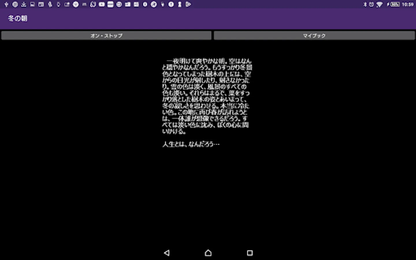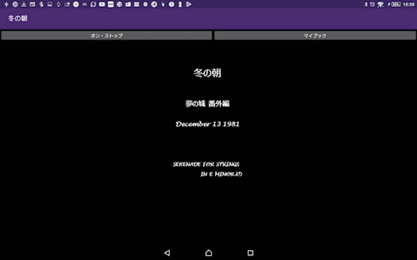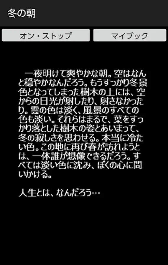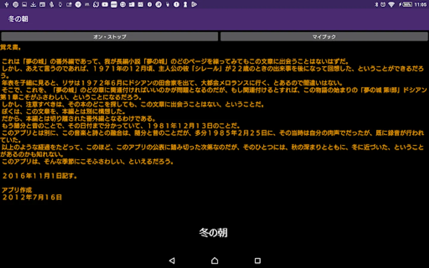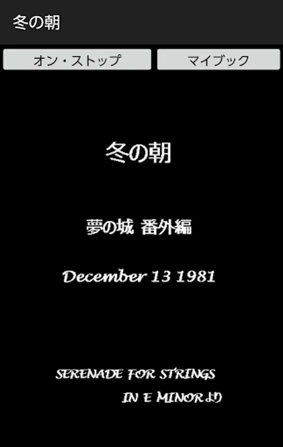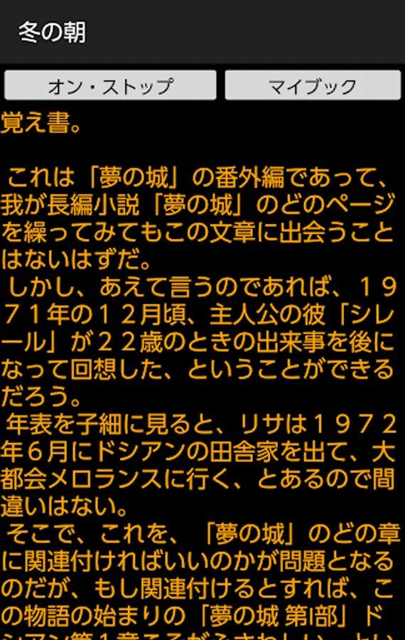 By pressing on / off button of this application, you can enjoy the extra edition of the long novel "Dream Castle" with recitation. Although this application basically does not require the introduction of reading application N2 TTS, it is only a specification corresponding to N2TTS only at the time of reading the title generated at the time of startup of this application, so I would like to enjoy reading reading body including it For those of you, download the application of N2 TTS.