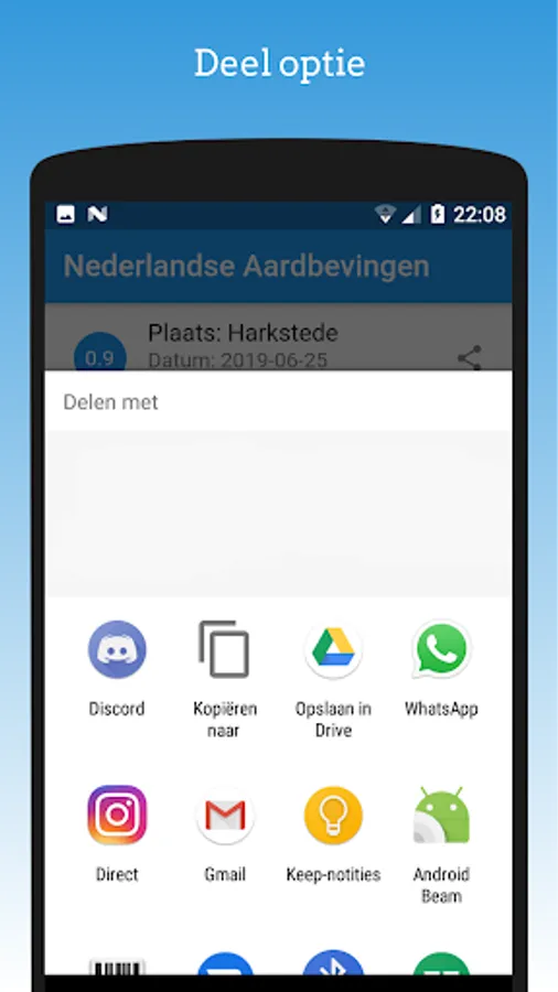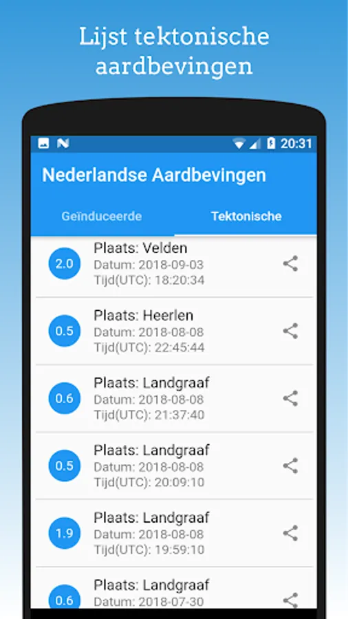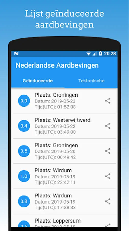 This app displays a list of induced and tectonic earthquakes in the Netherlands. The list of tectonic earthquakes also displays some earthquakes of Germany and Belgium. Besides this you can easily share information about an earthquake.